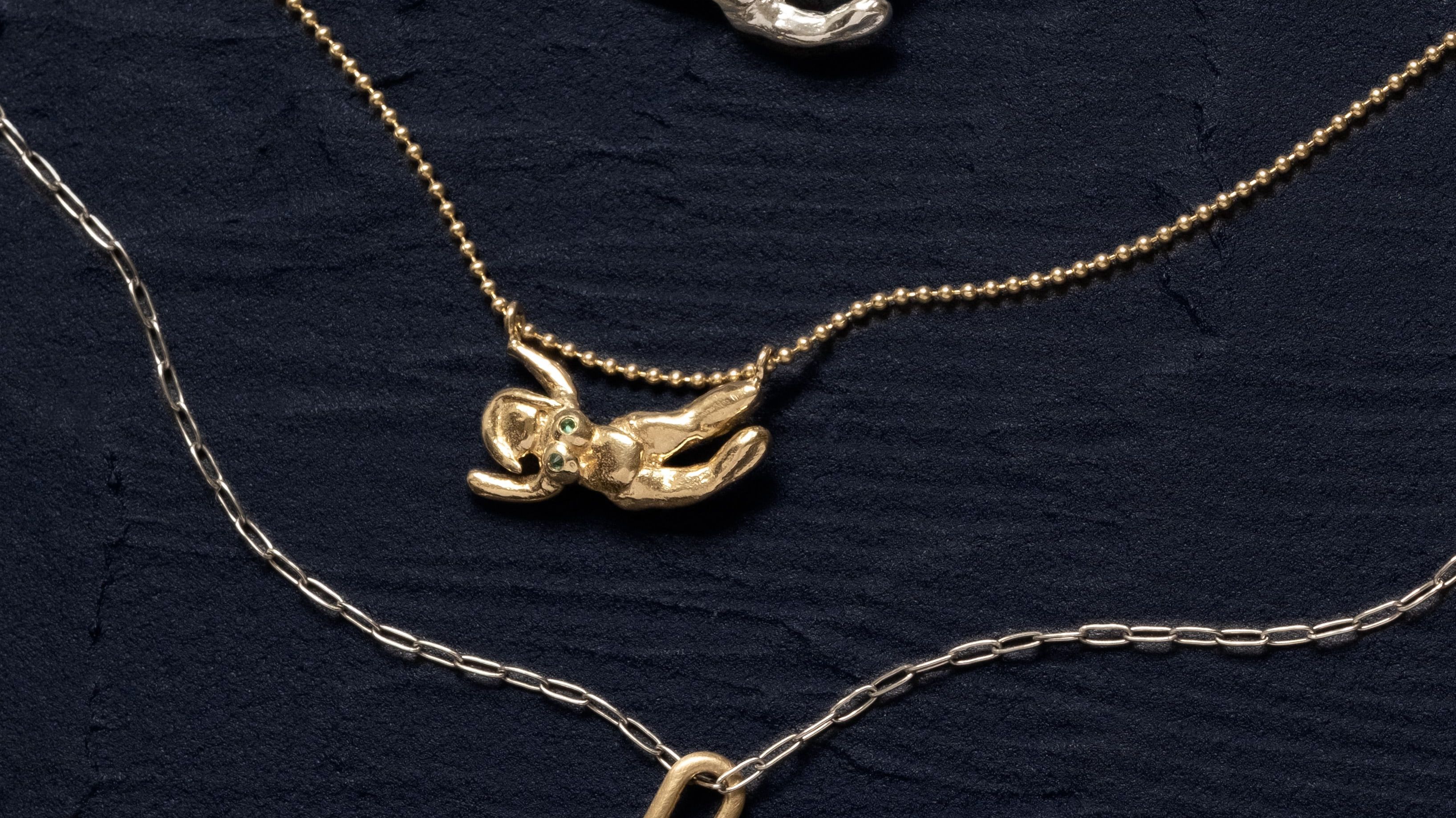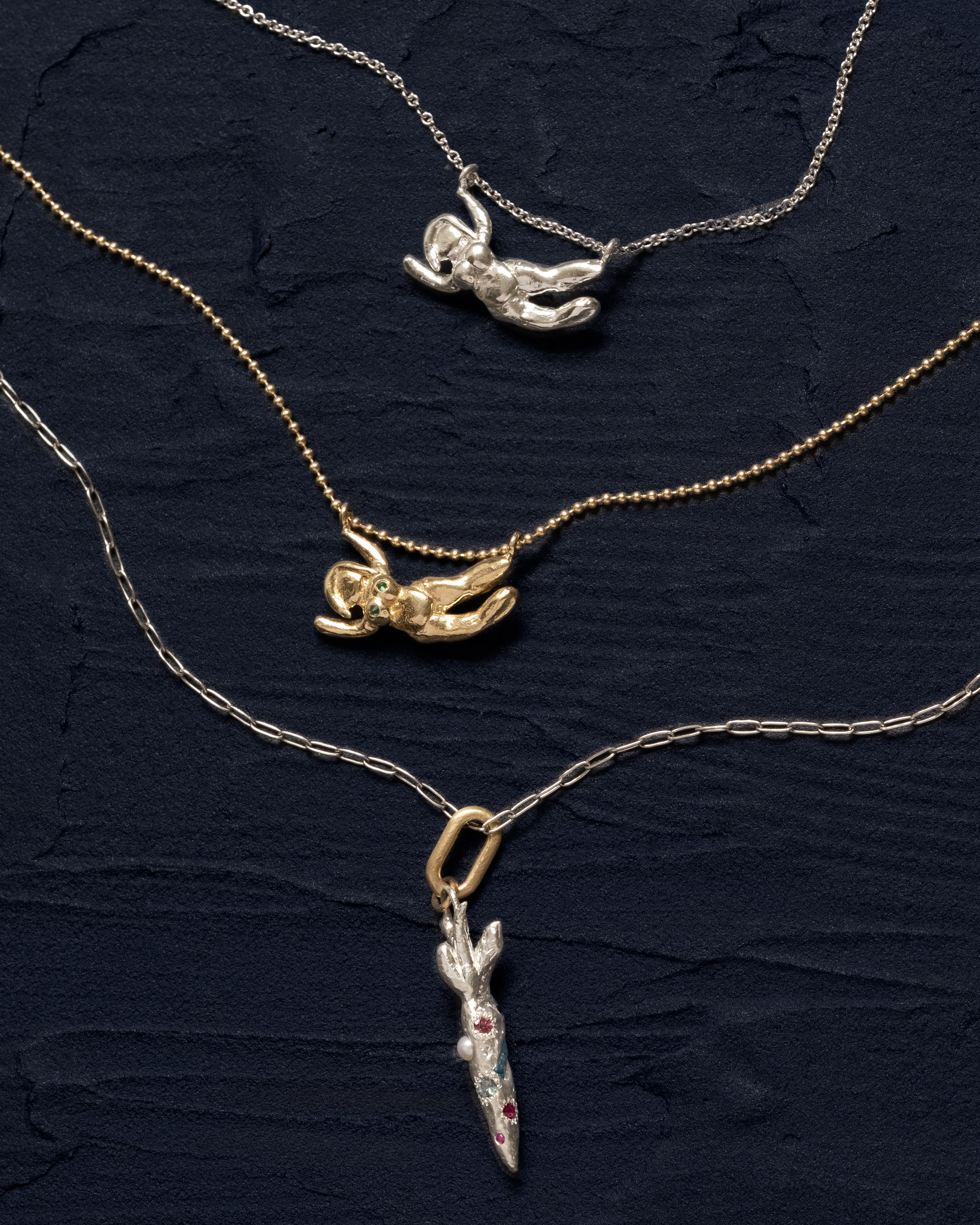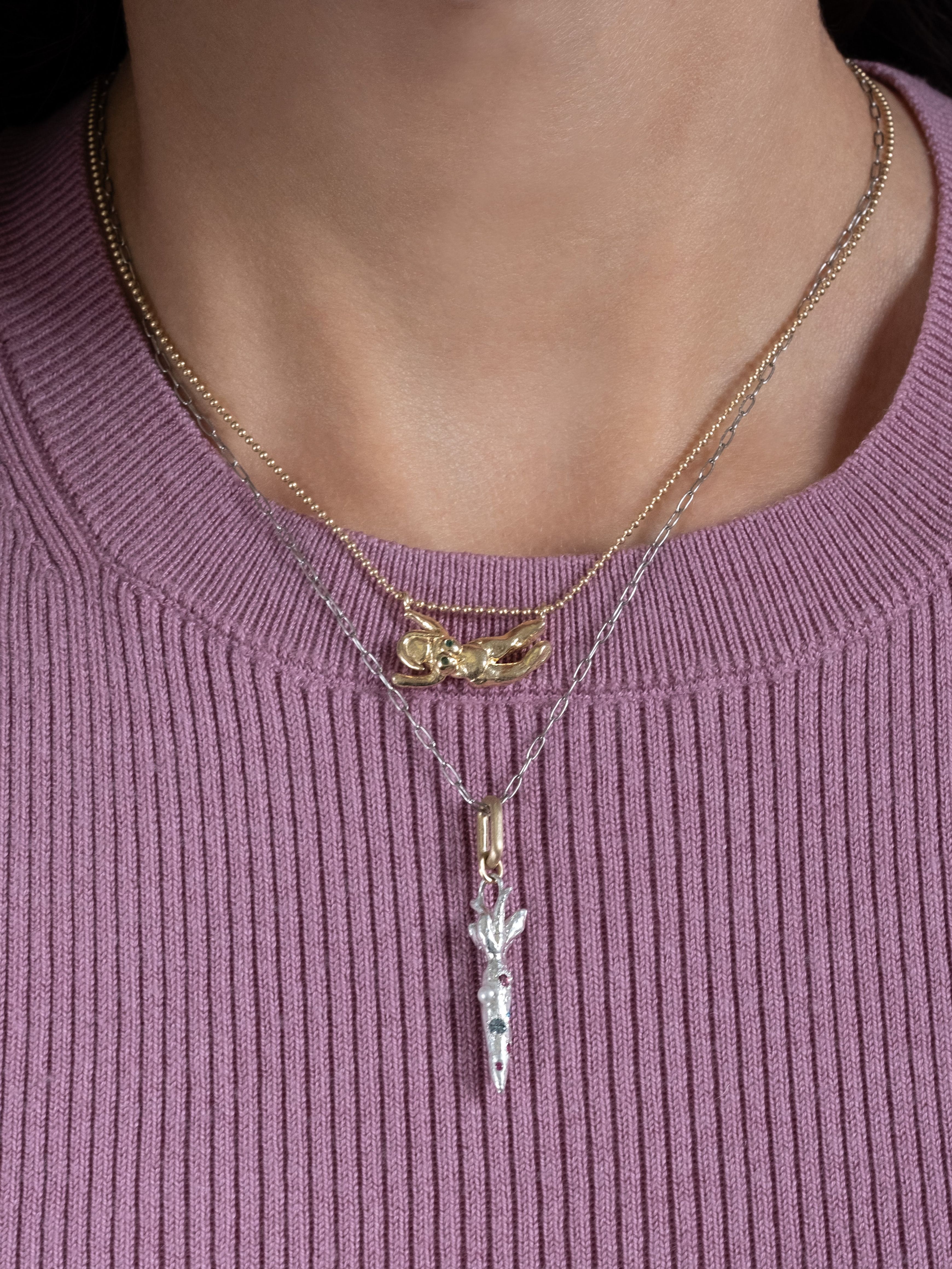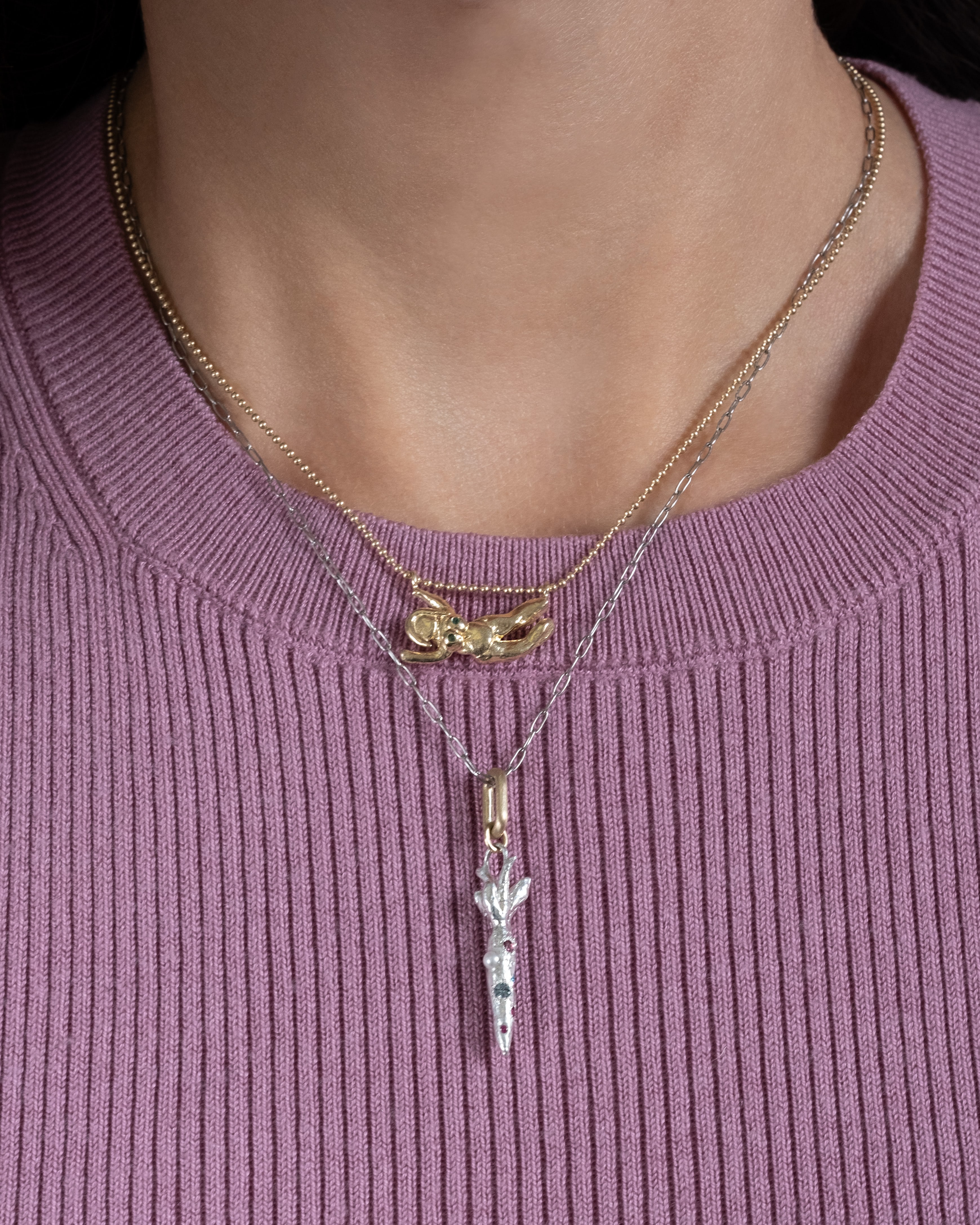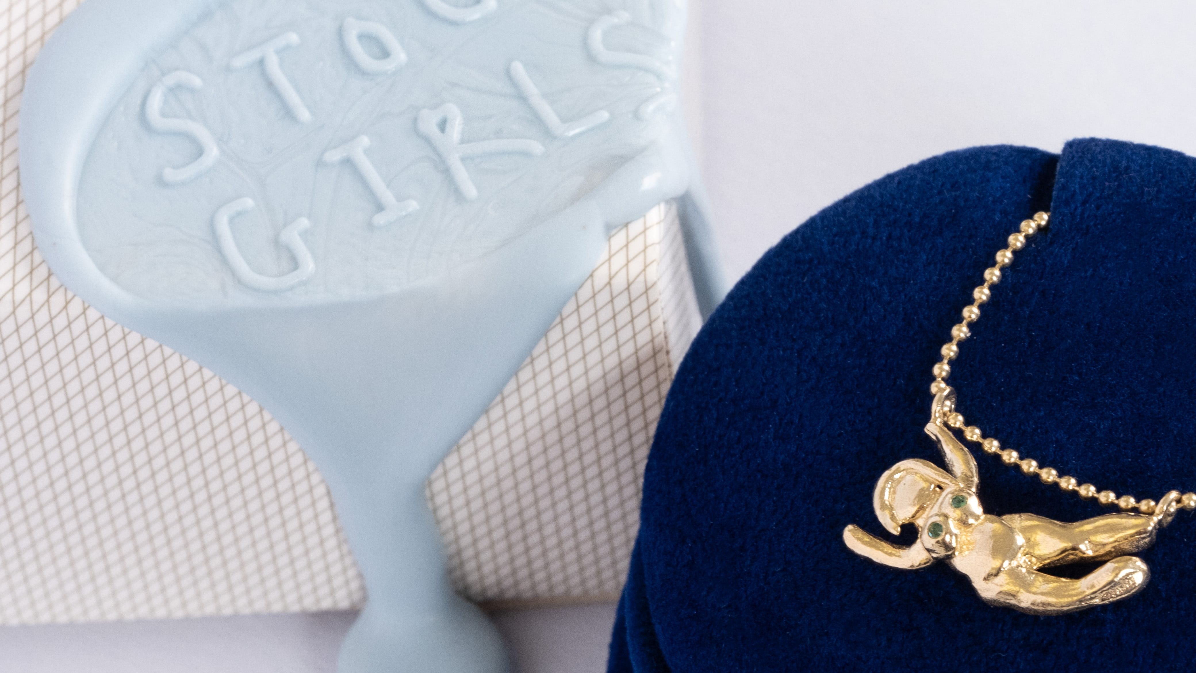 STOUT GIRLS is a collaborative project by Katie Stout and Simone Paasche, interpreting Katie’s sculptural language through the lens of Simone’s fine jewelry practice. The collection is a joyful exploration of girls, gemstones and vegetables.