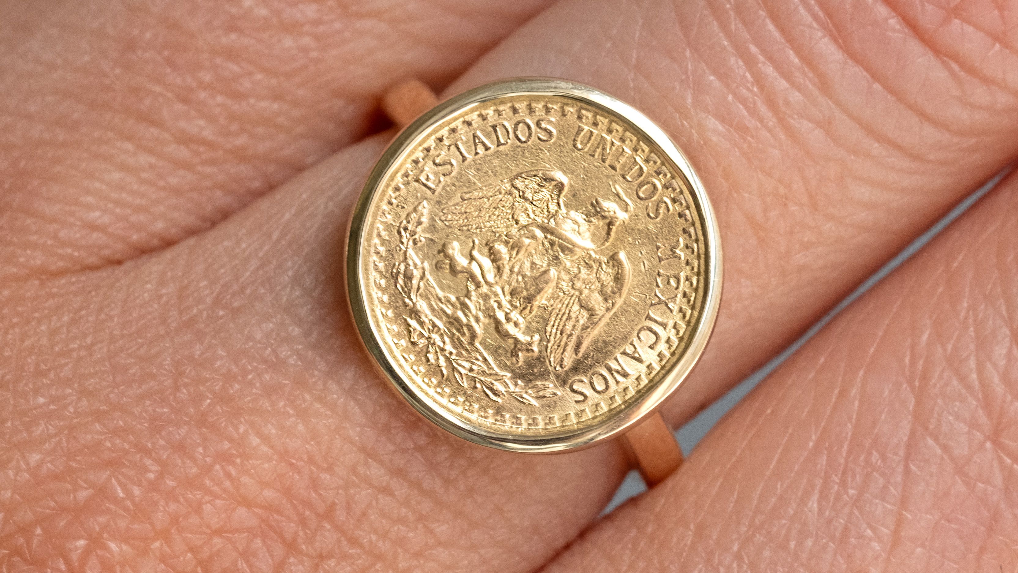 Theresa's family has incorporated a 1919 Mexican coin in their wedding ceremonies going back to her great-great grandmother. We were honored to be entrusted with combining this unique heirloom with her great-great grandmother's gold wedding band for Theresa to wear as a pinkie ring. We were able to resize the band and build out a delicate gold bezel which we carefully set her coin in.