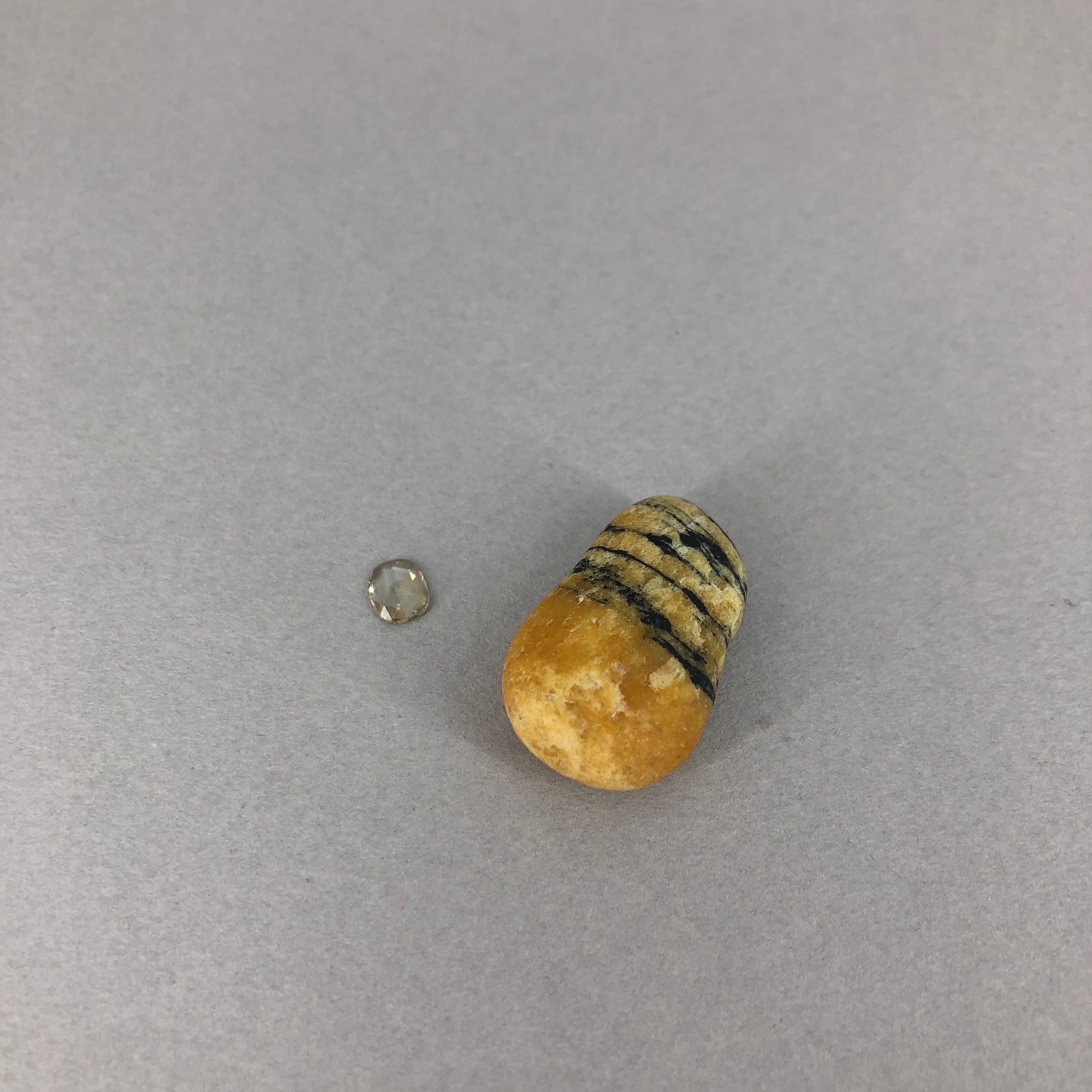 Claire's husband found this smooth stone at the lake near her beloved family cabin. It contrasts perfectly with a sparkling rose cut diamond she brought back years ago from a trip to India.
