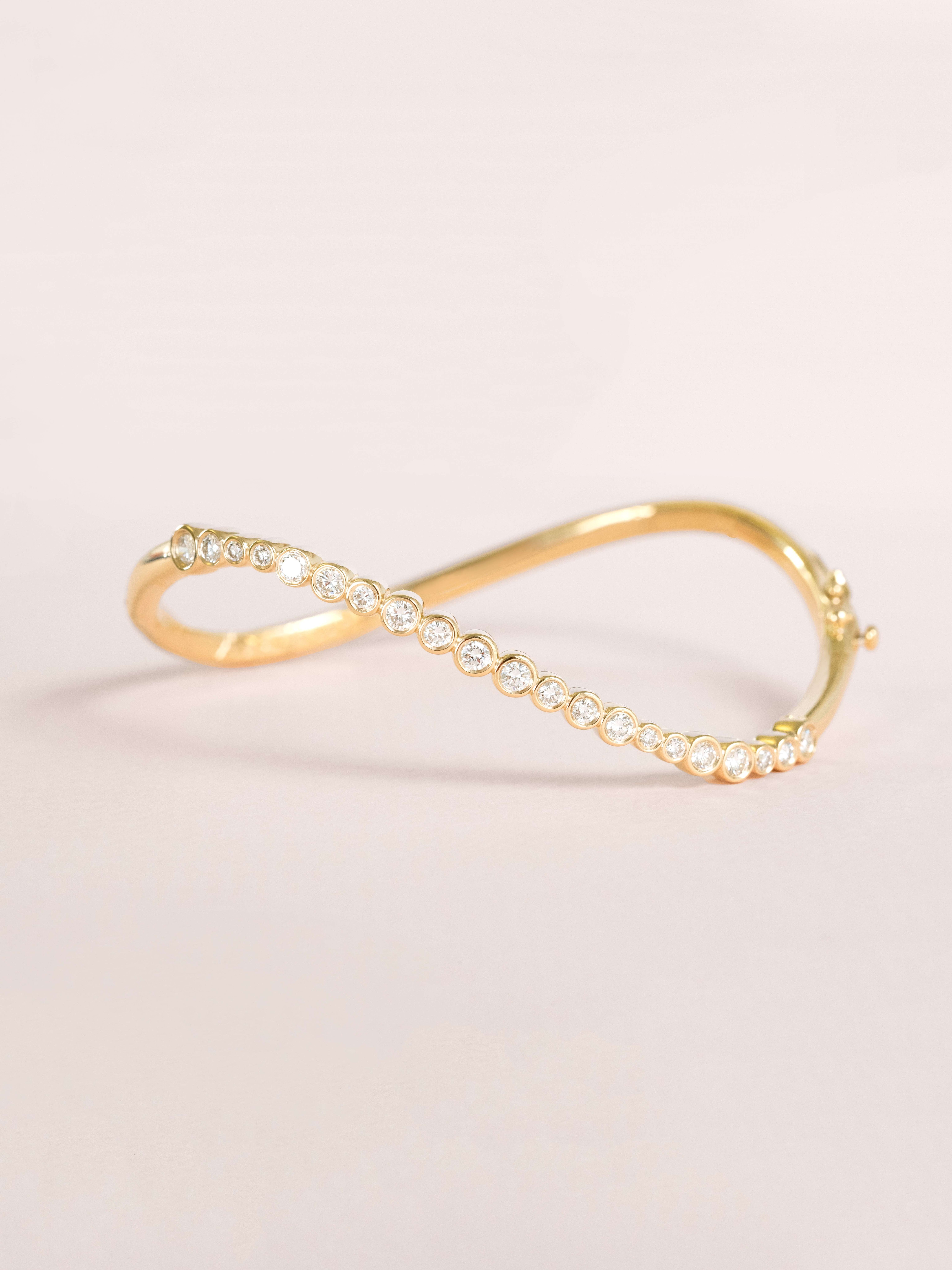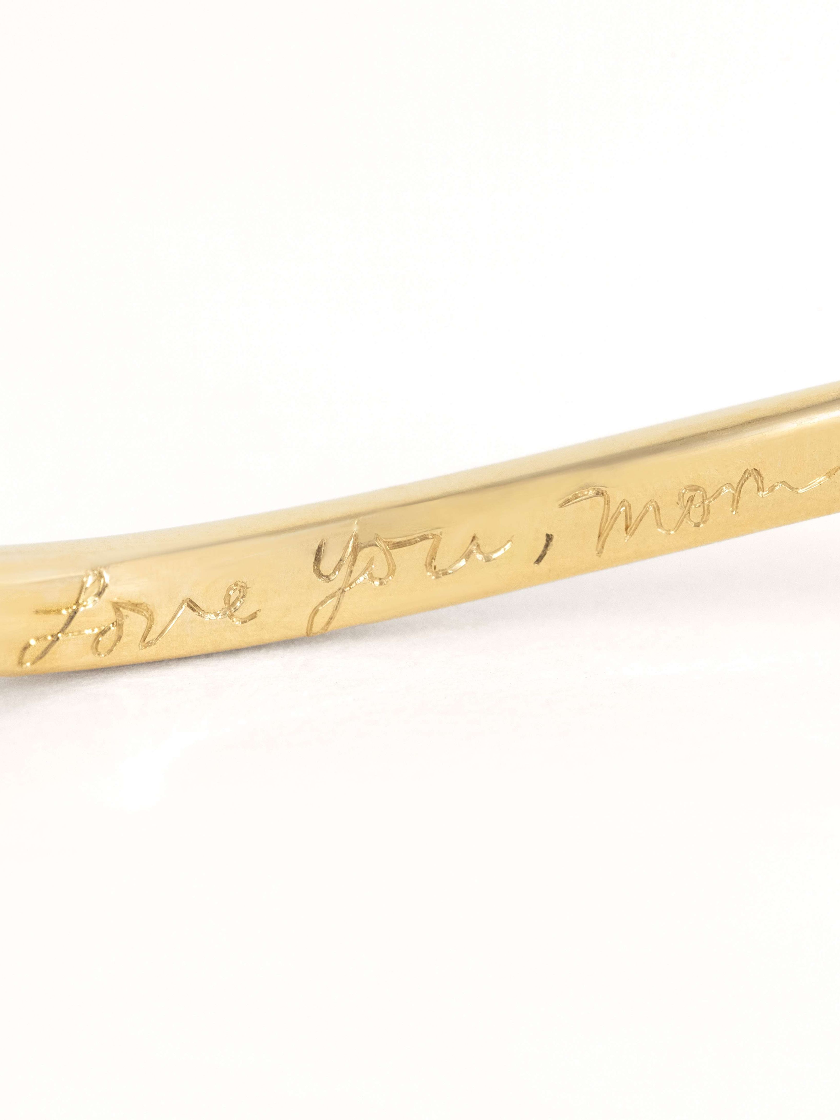 Brenna wanted to create an elevated but playful piece of jewelry to honor her mom with a few diamonds from her mom's jewelry. We designed a wavy hinged bangle with bezel set diamonds following a curved line around her wrist. Inside, "Love you, Mom" is engraved in her mom's handwriting from a an old card she had sent Brenna. This bangle hits just right, the diamonds are so sparkly and the hand fabricated custom hinge allows for a close fit.