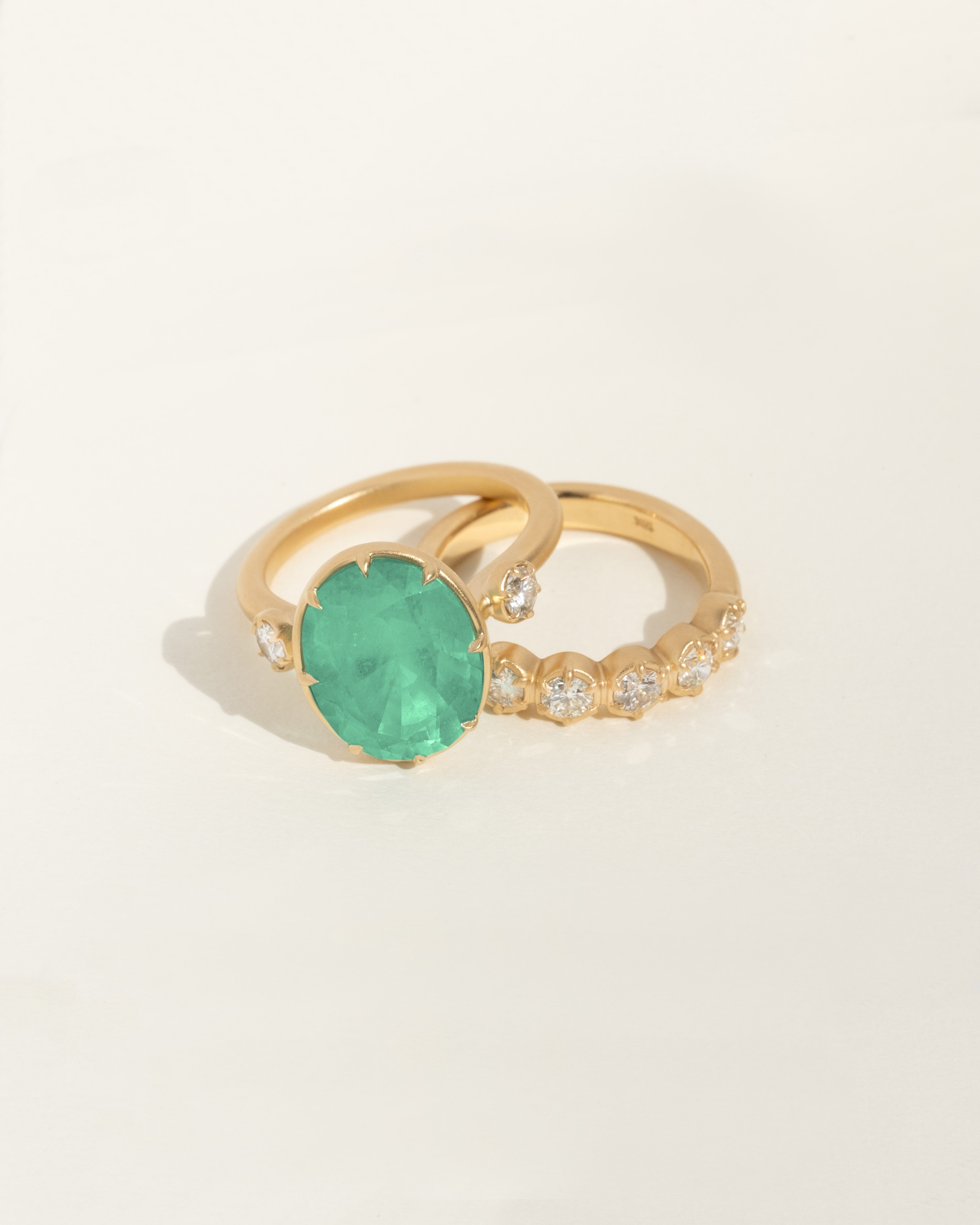 AJ fell in love with an emerald (with a stunning color that instantly made me want to find the matching pantone hue). She inquired with us about setting it into a show stopping custom engagement ring for special occasions. She also had a few sentimental diamonds from a pair of vintage earrings that belonged to her mother that were important to include in her wedding set. We crafted an antique inspired collet style setting for AJ's emerald accented with diamonds from mother's earrings as well as a wedding band for every day. The band echoes the design details of the engagement ring, but at a more delicate scale.