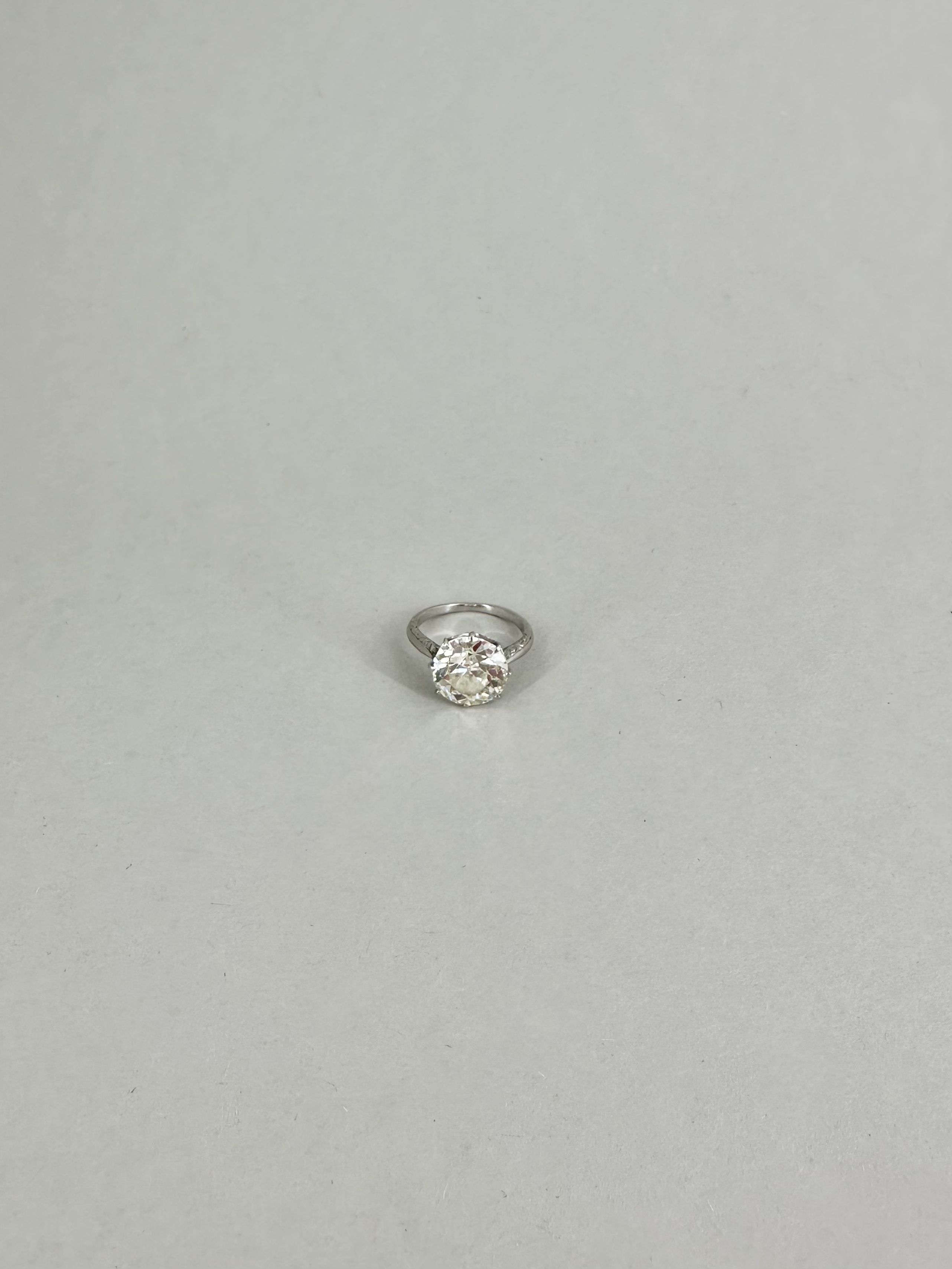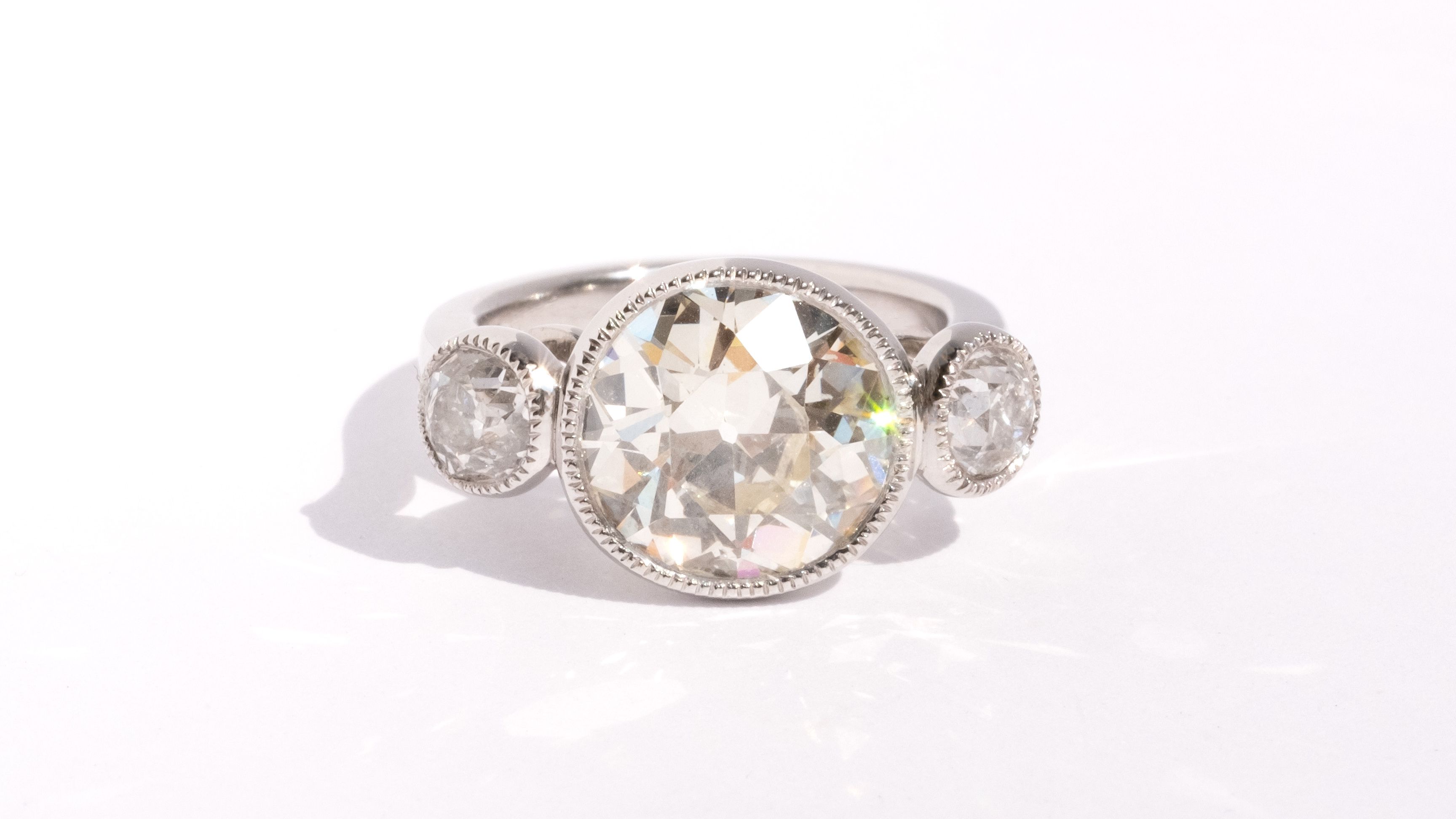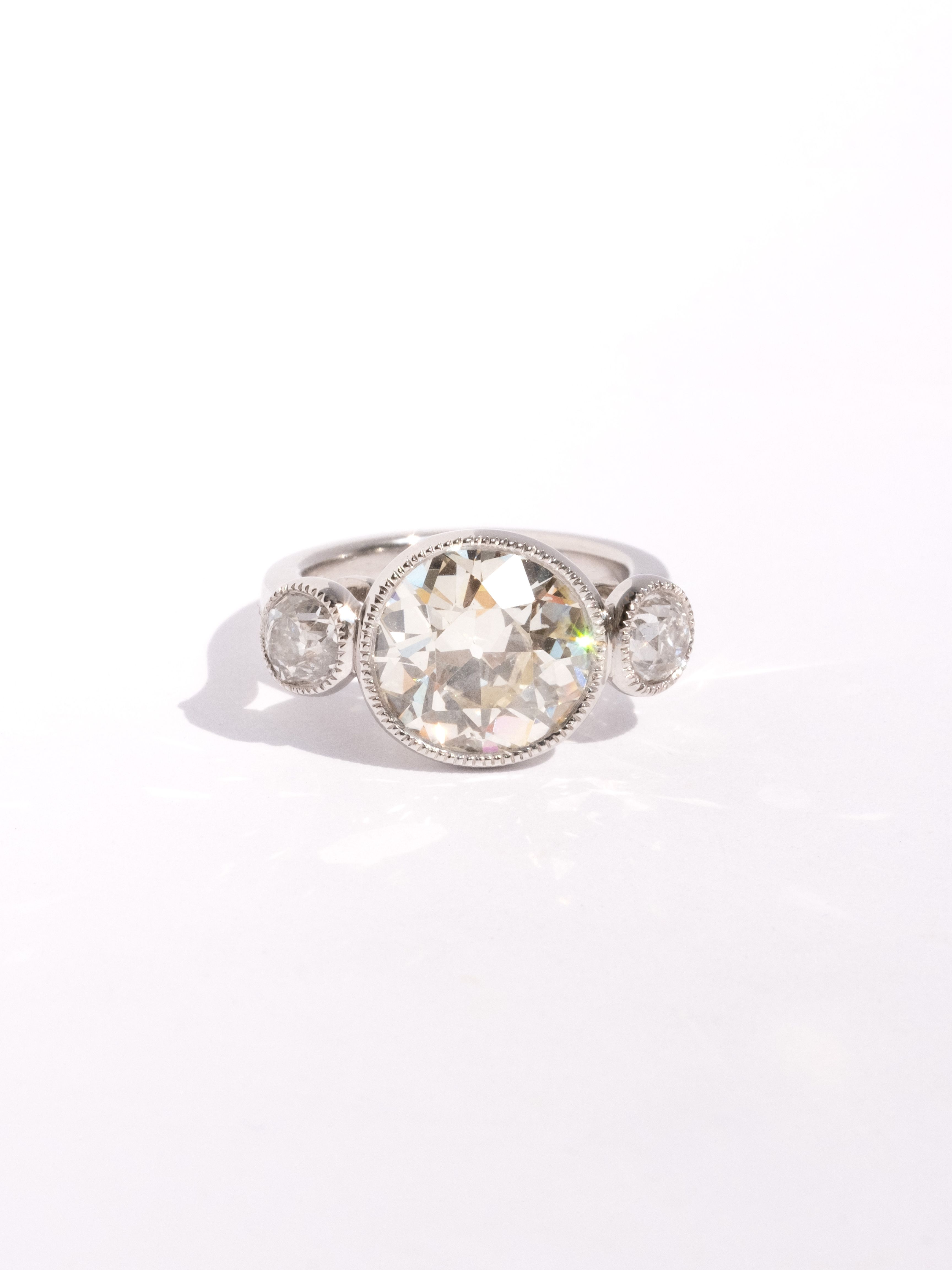 Alicia had a gorgeous Old Mine Cut diamond in a very simple claw prong setting that, unfortunately, was catching on everything. She inquired with us about resetting it in a more wearable antique inspired design. We sourced beautifully proportionate Old Mine Cut side stones and crafted a three stone cathedral style bezel setting in platinum for her. We added very delicate millegrain details around the three bezels, leaning into the antique feeling. The updated ring is stunning and we were so delighted to have it in our studio.