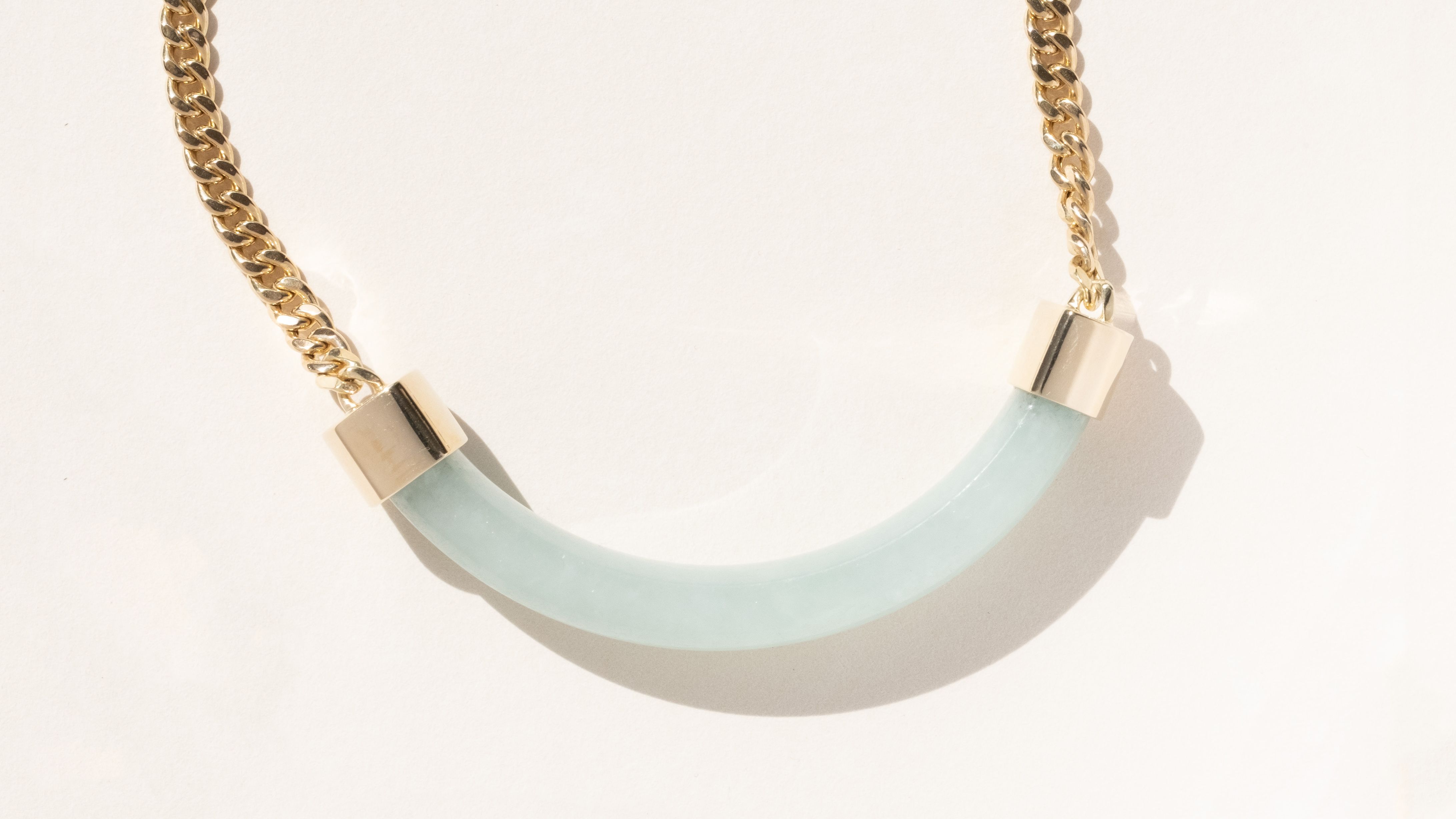 Robin wore a jade bangle her entire life and loved the significance of it. When it shattered, she was devastated. Her mom shared with her that when jade shows cracks, that means it has protected you. We used a segment of Robin's shattered bracelet to create a necklace, capping the ends in gold and adding a substantial curb chain for balance.