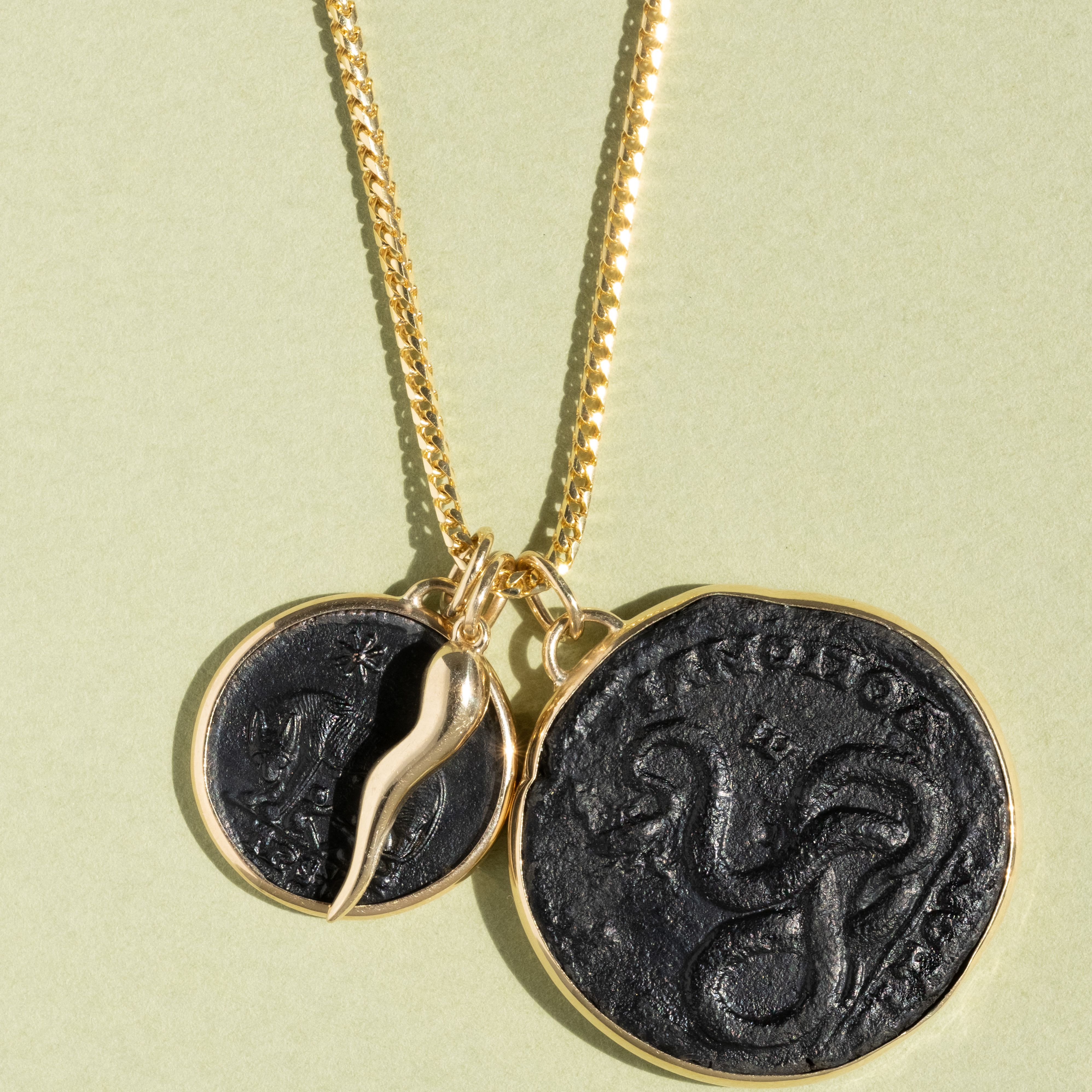 We set the two blackened coins in bright gold bezels, combining them with a cornicello, an Italian symbol said to ward off evil, on a substantial box chain. We love how all of the elements of this talismanic piece came together.