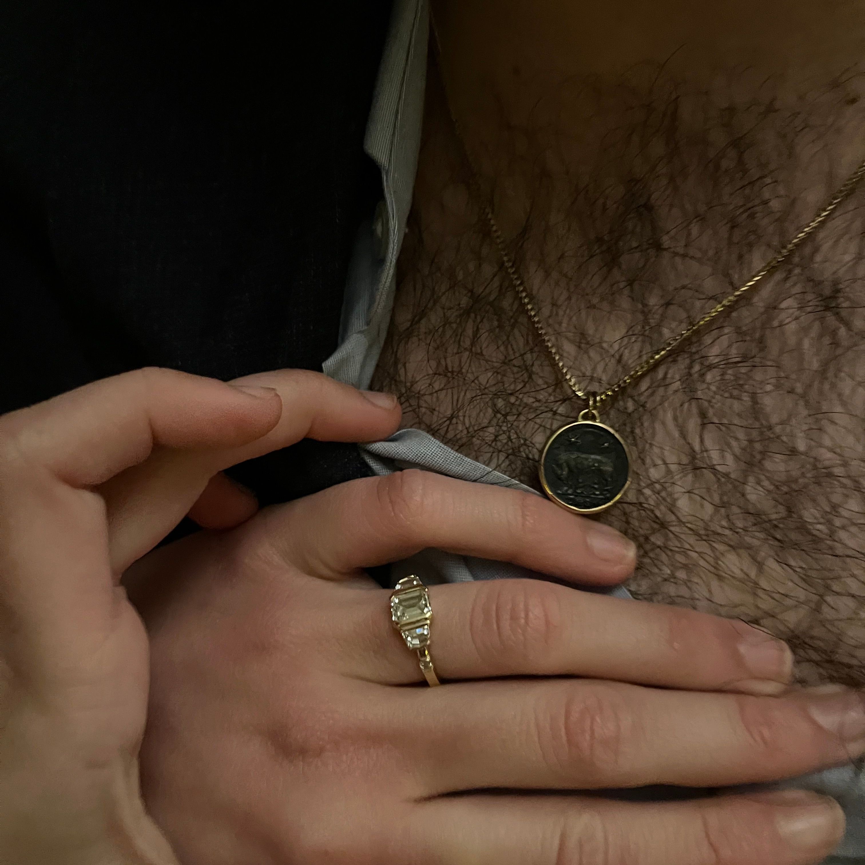 Ascanio's father gifted him with a coin necklace at birth that unfortunately went missing when he was a teenager. Having purchased two of our sourced coins, an ancient Roman piece depicting a twisted serpent and a bronze coin depicting Romulus and Remus, he wanted to create a symbolic piece that paid homage to his beloved lost coin necklace.