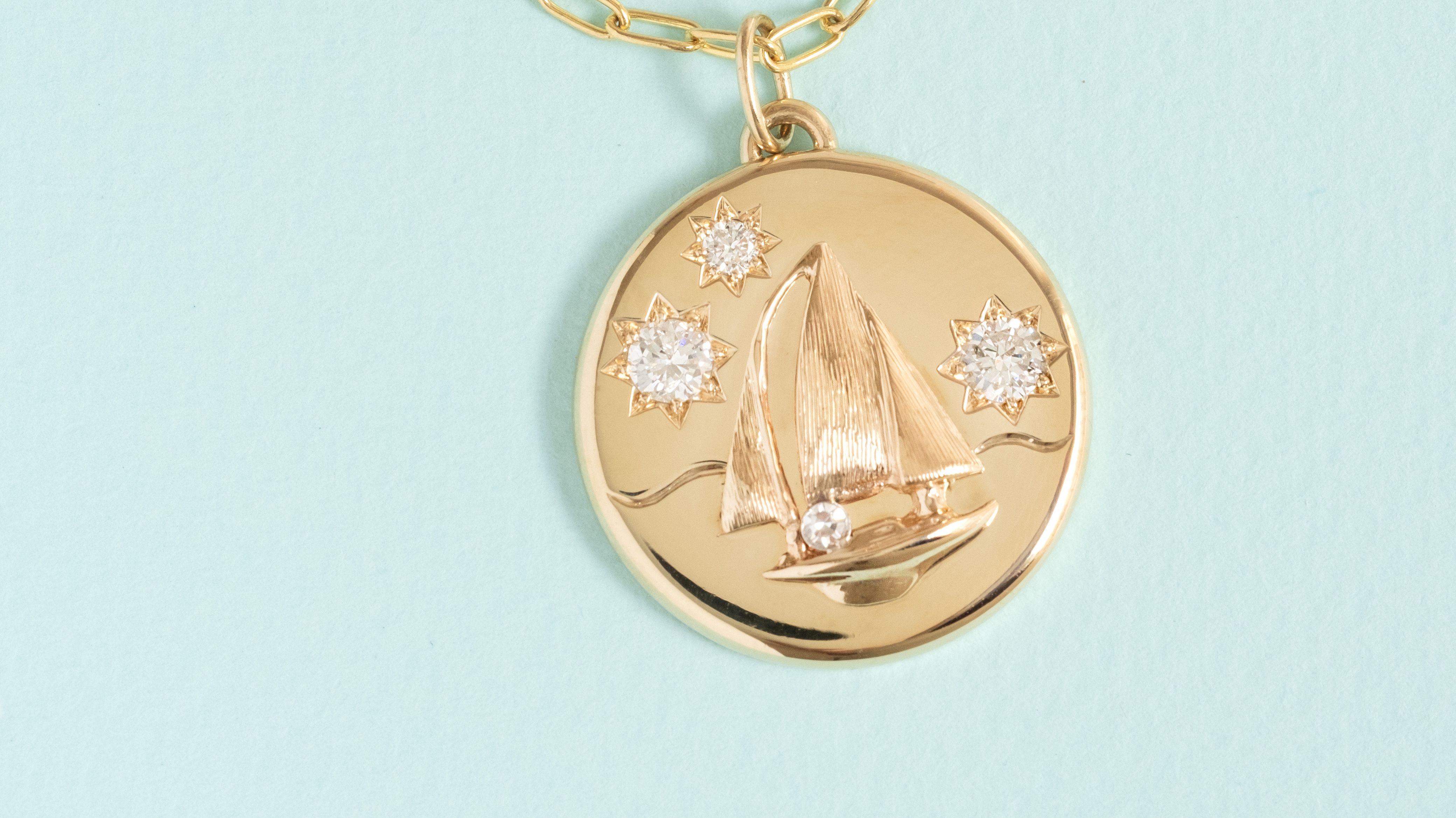 It is so satisfying and special to take one family heirloom and create two pieces to be shared between siblings. After Emily's father passed away, her brother gave her a tie pin that had belonged to him. Emily was drawn to the boat motif, as a talisman for moving through a difficult time. We very carefully removed the boat charm from the tie pin and set it into a gold medallion. We added two diamonds from a pair of studs, and one petite sourced diamond to create the feeling of a night sky.