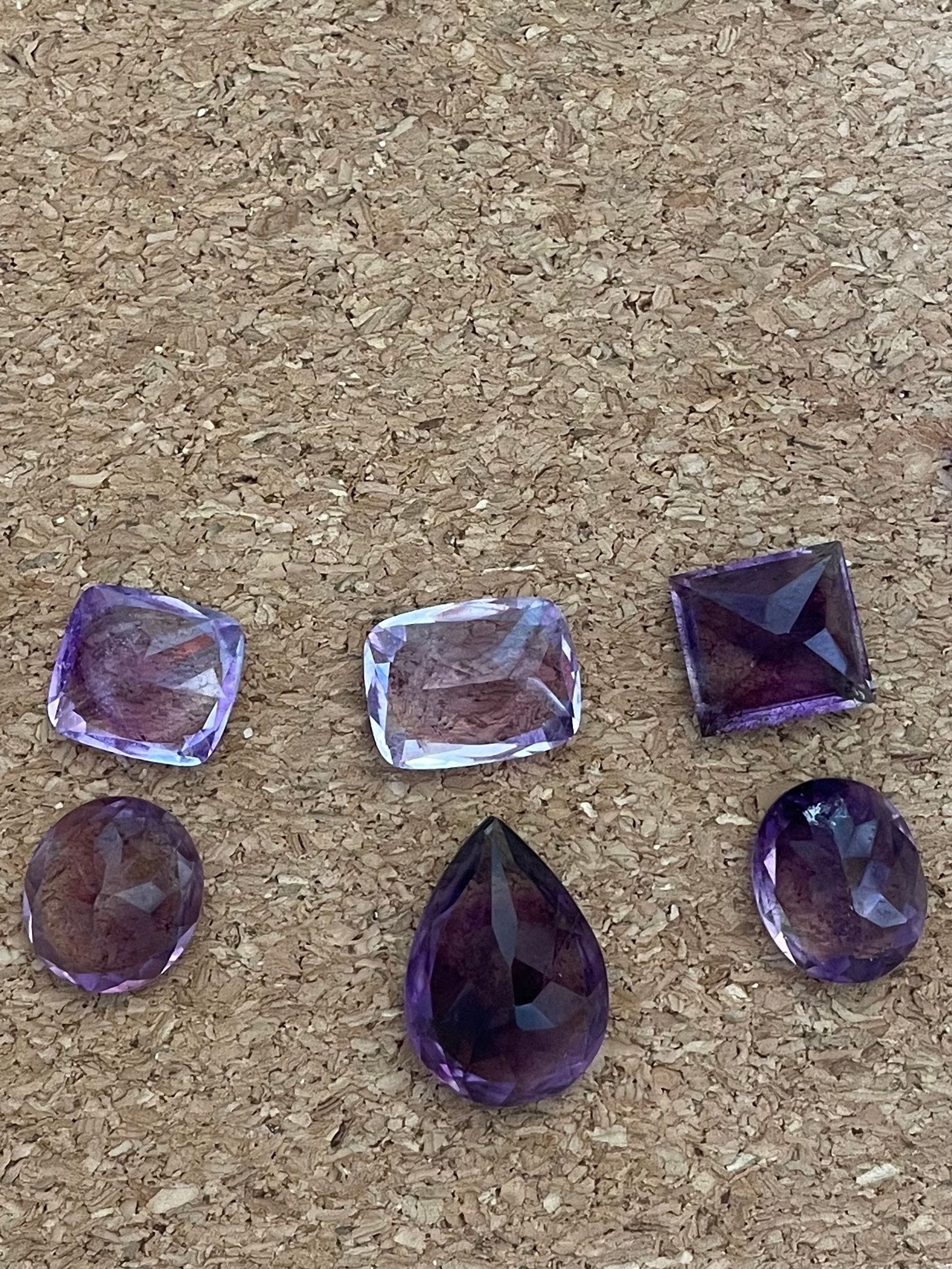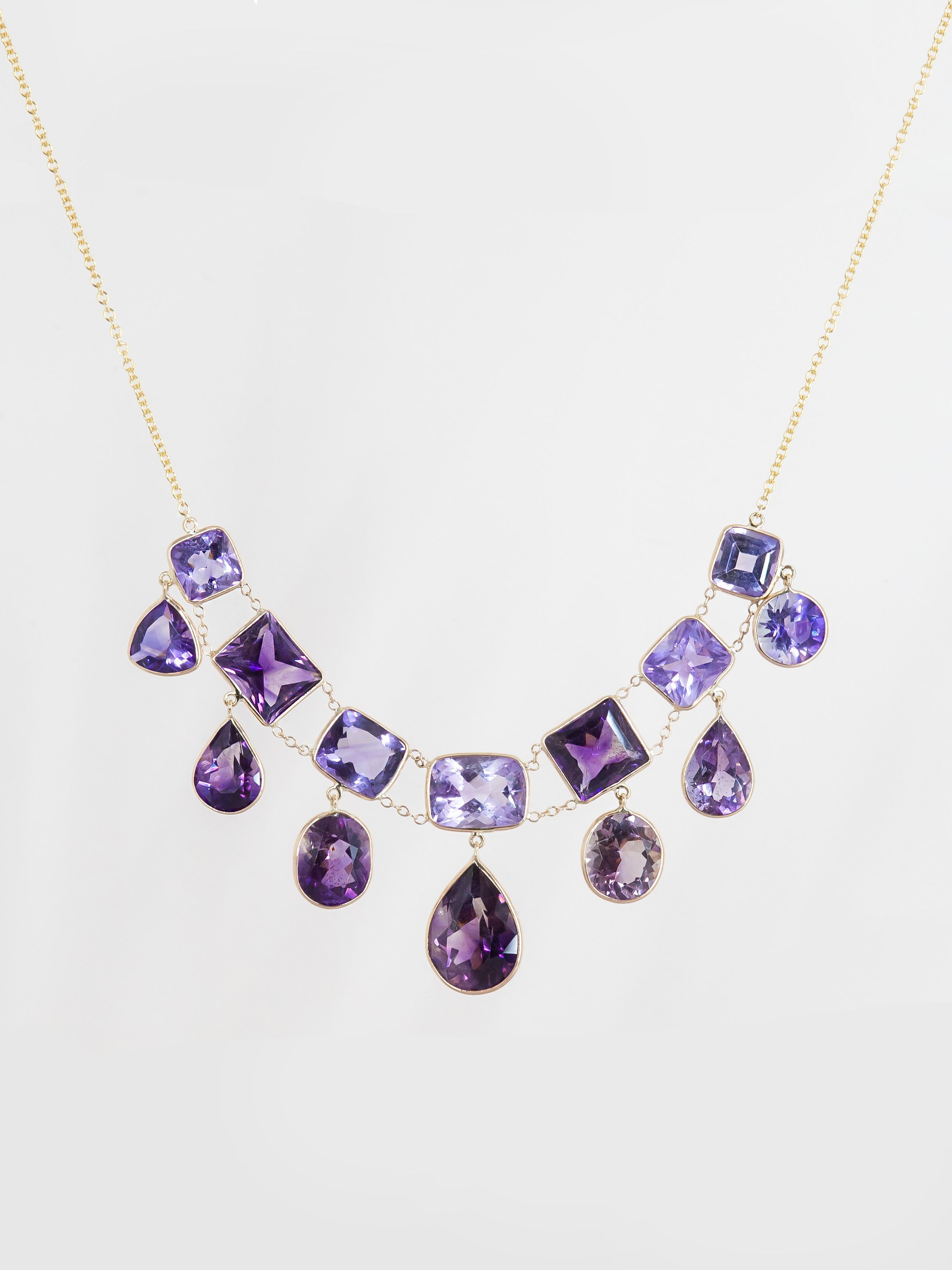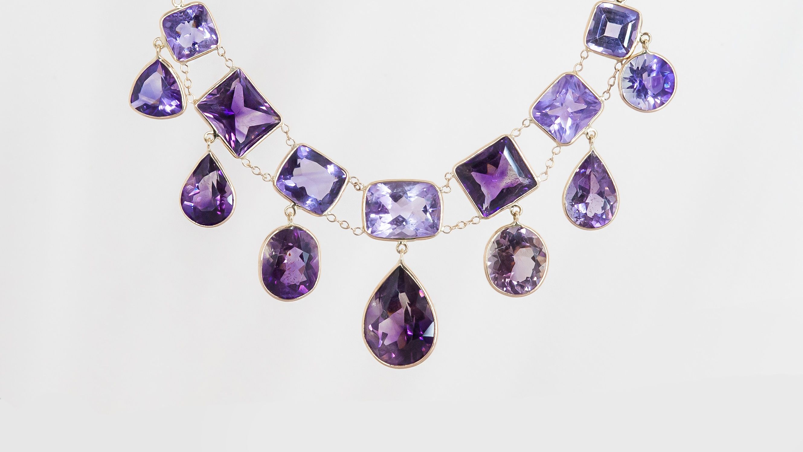 Erin's gemstone collection included a treasure trove of amethysts collected over her life and travels. Inspired by elements of antique festoon and swag necklaces, this design brings each unique amethyst together harmoniously. Every stone is a slightly different color, shape, and size (one of the unique challenges of our design work!).