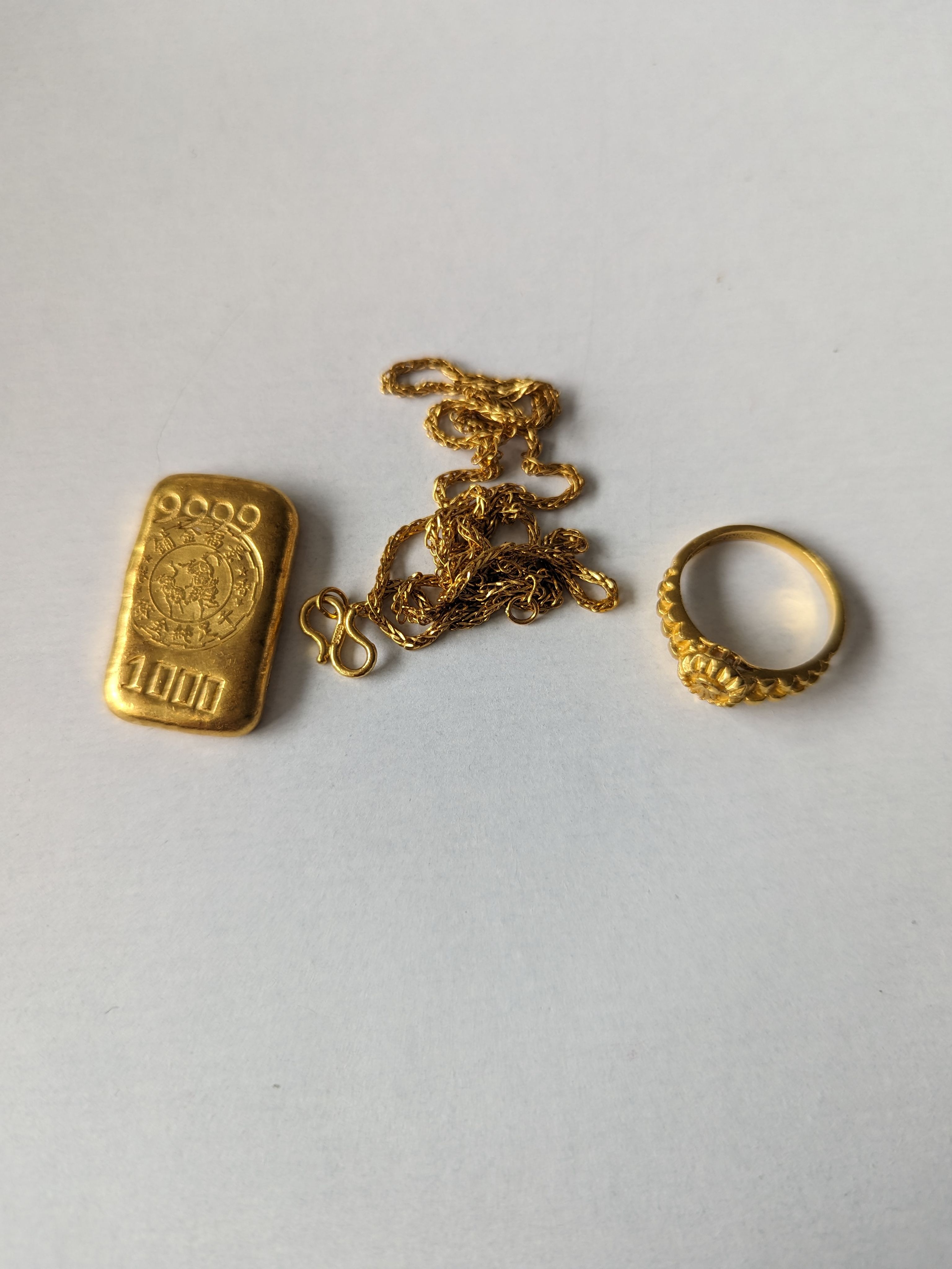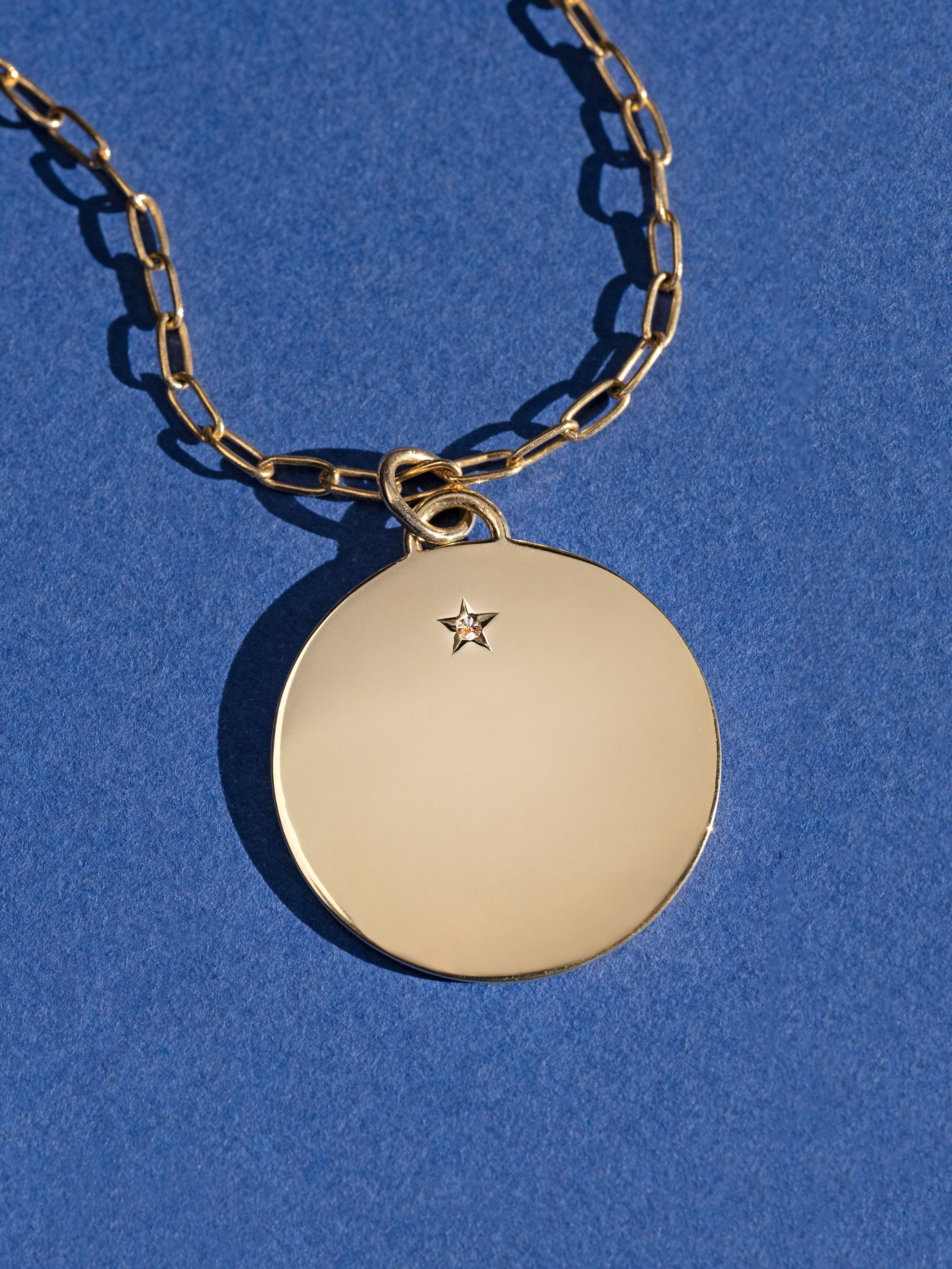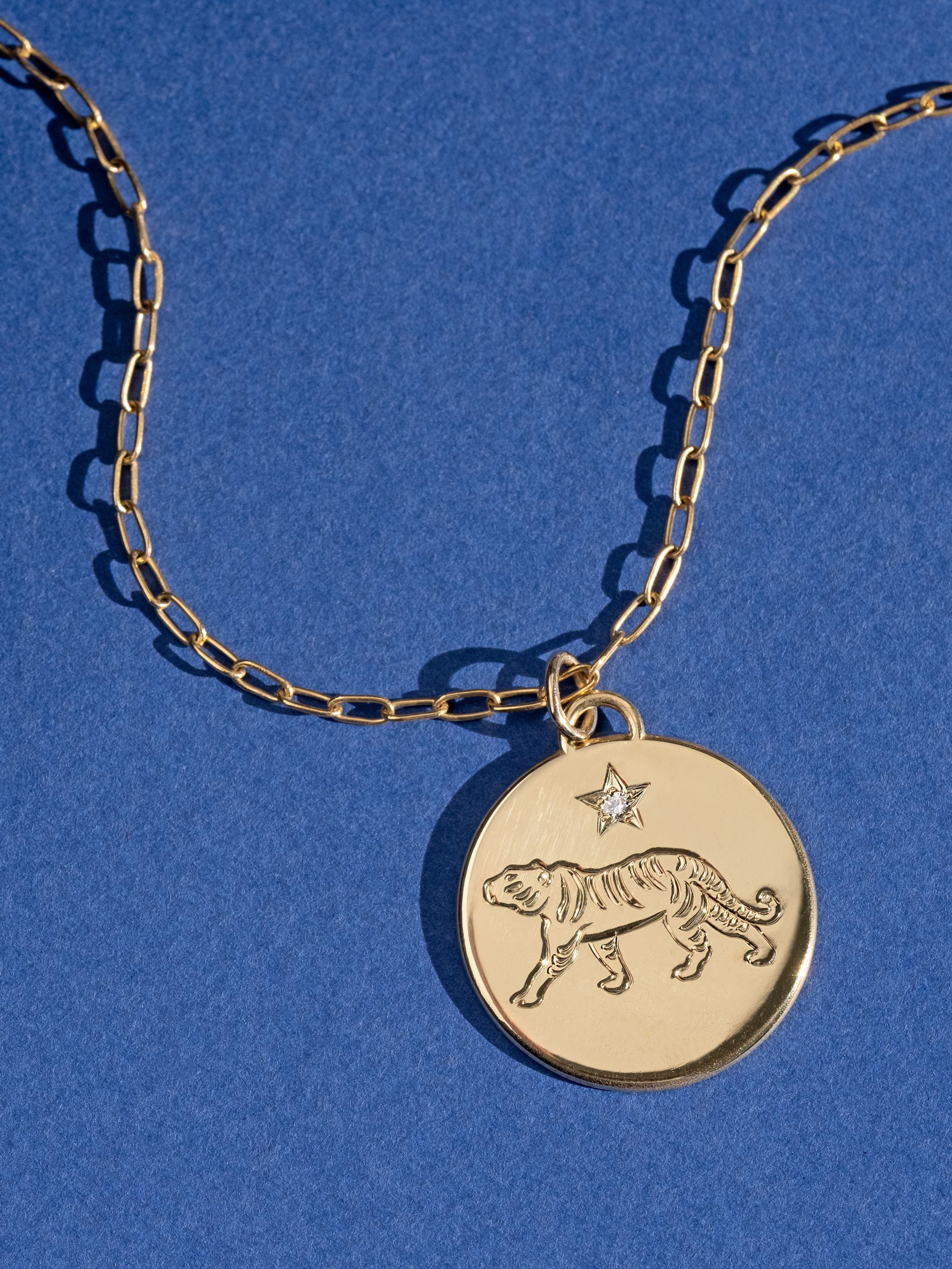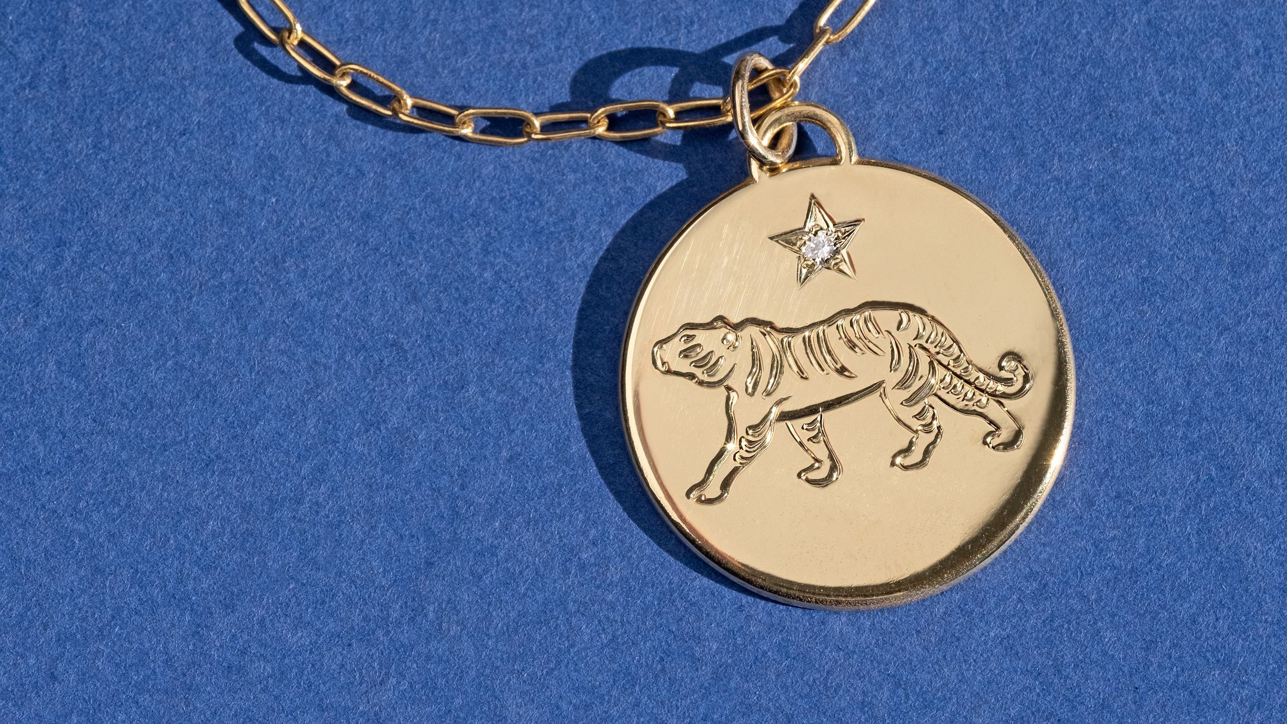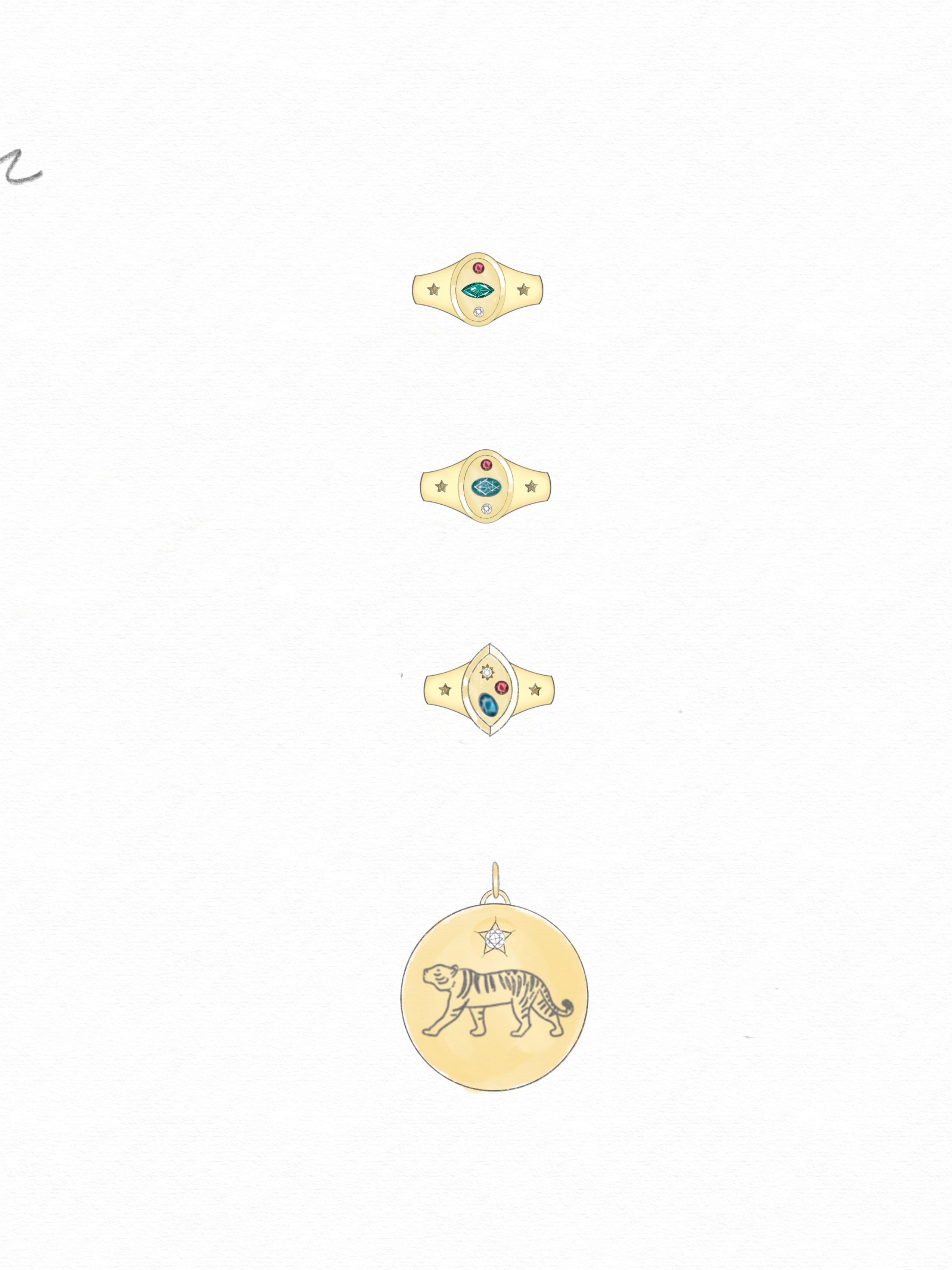 24kt is typically to soft for daily pieces as it wears down and loses detail quickly. We melted and alloyed his inherited gold into 18kt to create a bold custom medallion featuring symbols that resonated with him - a hand engraved tiger and a petite 5 pointed star set with a diamond. We used the remaining gold to create a flat top signet ring set with an emerald, a ruby, and diamonds.