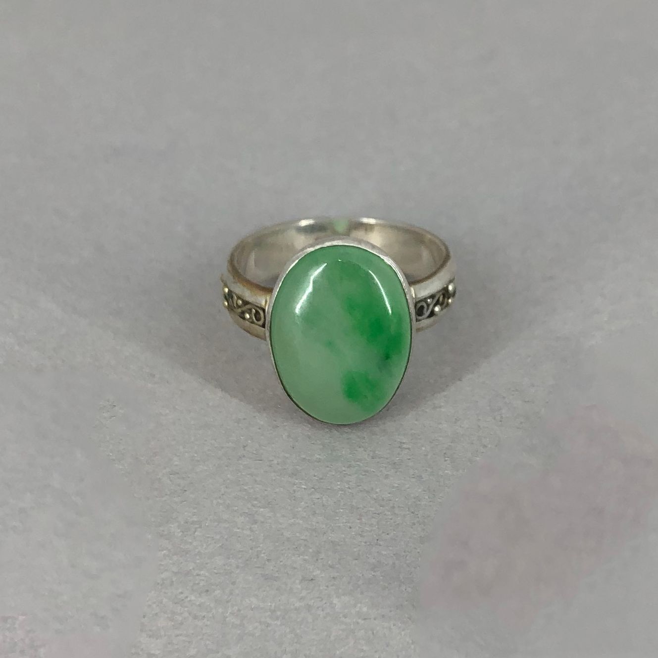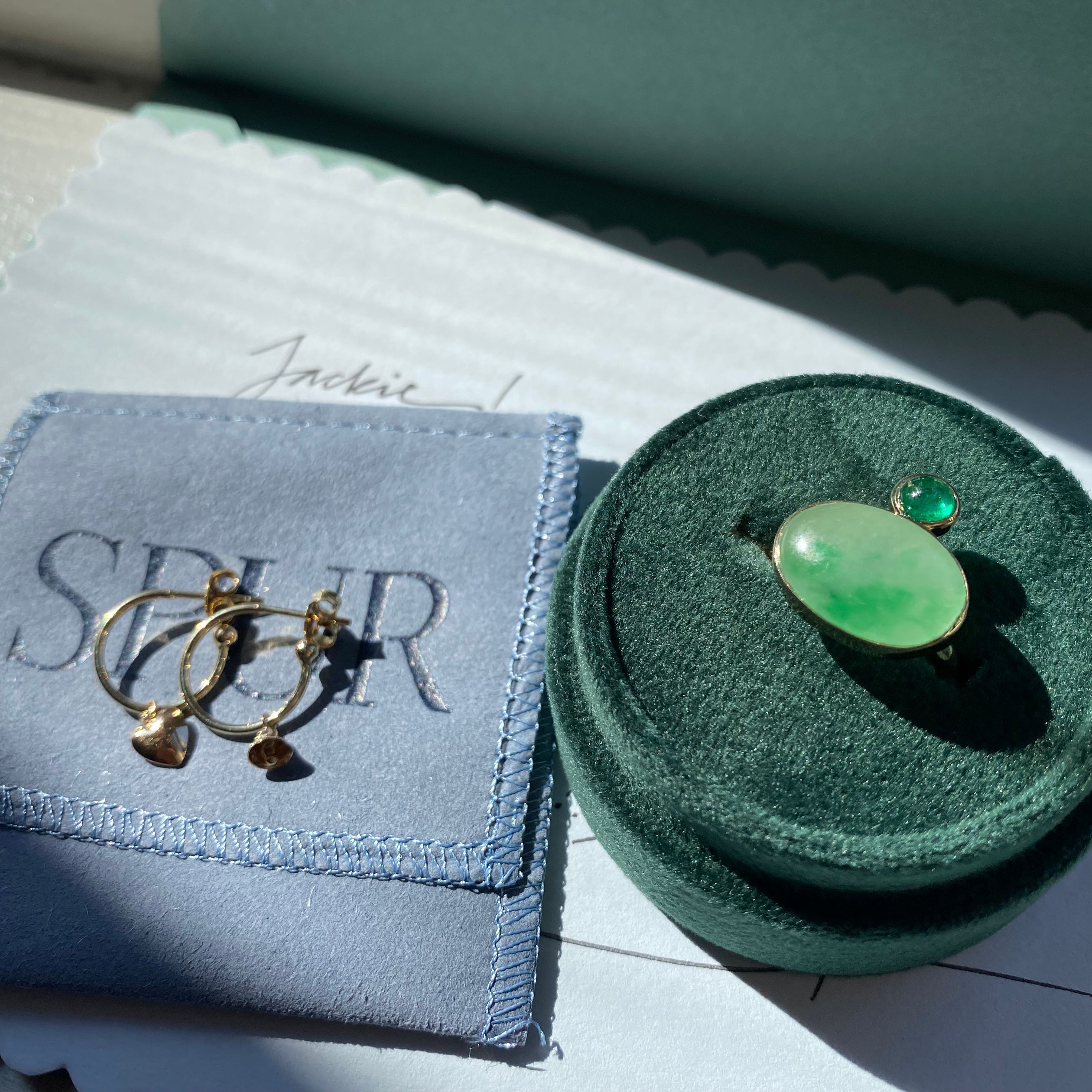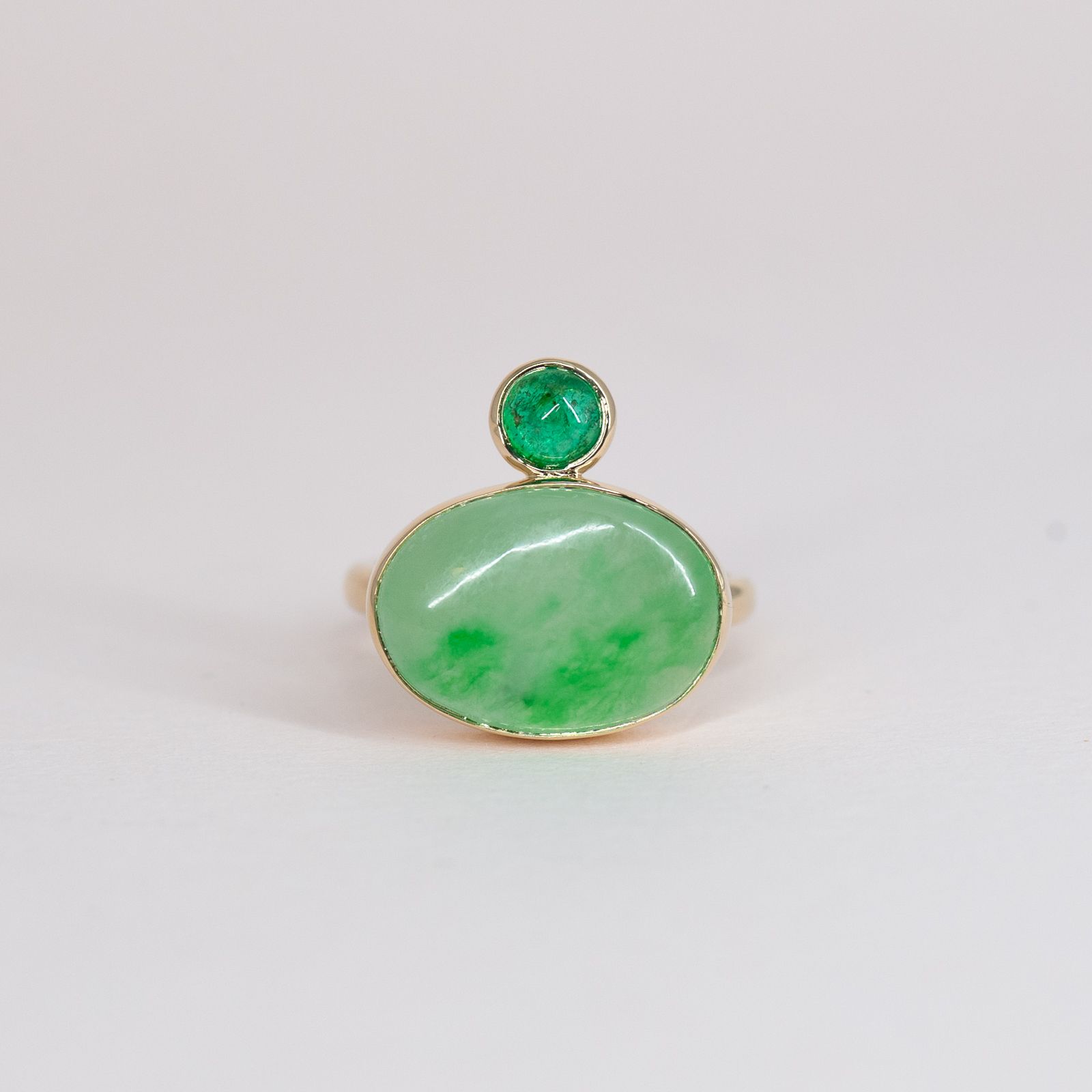 Jackie’s jade had a beautiful painterly quality, even more so than we knew when we designed her pieces. Positioned East-West, the darker greens look landscape-like. We sourced a vibrant emerald cabochon to complete the green color story. In the studio, we call this a “stone henge” ring because it looks a little bit like an intentional stack of small stones.