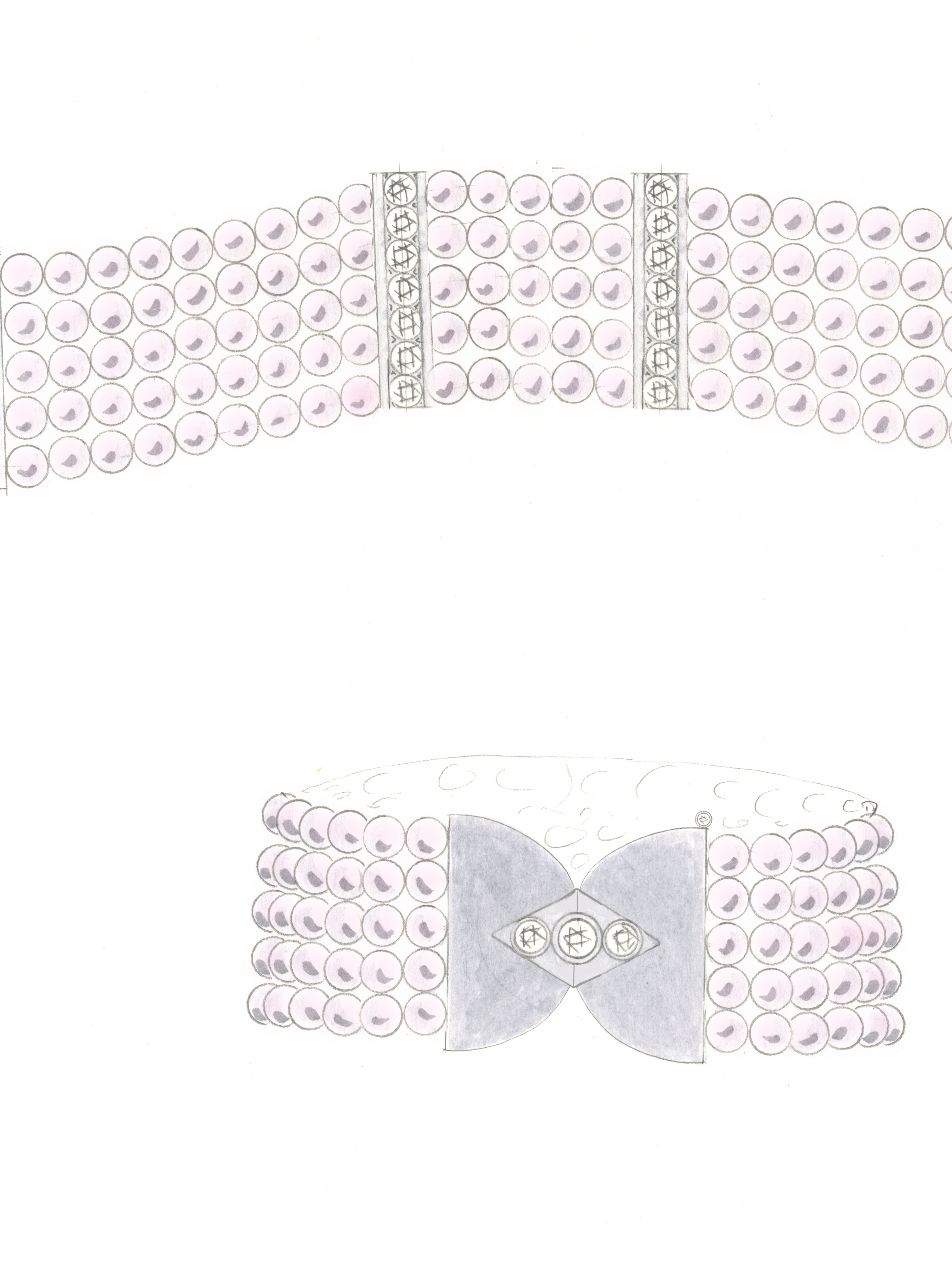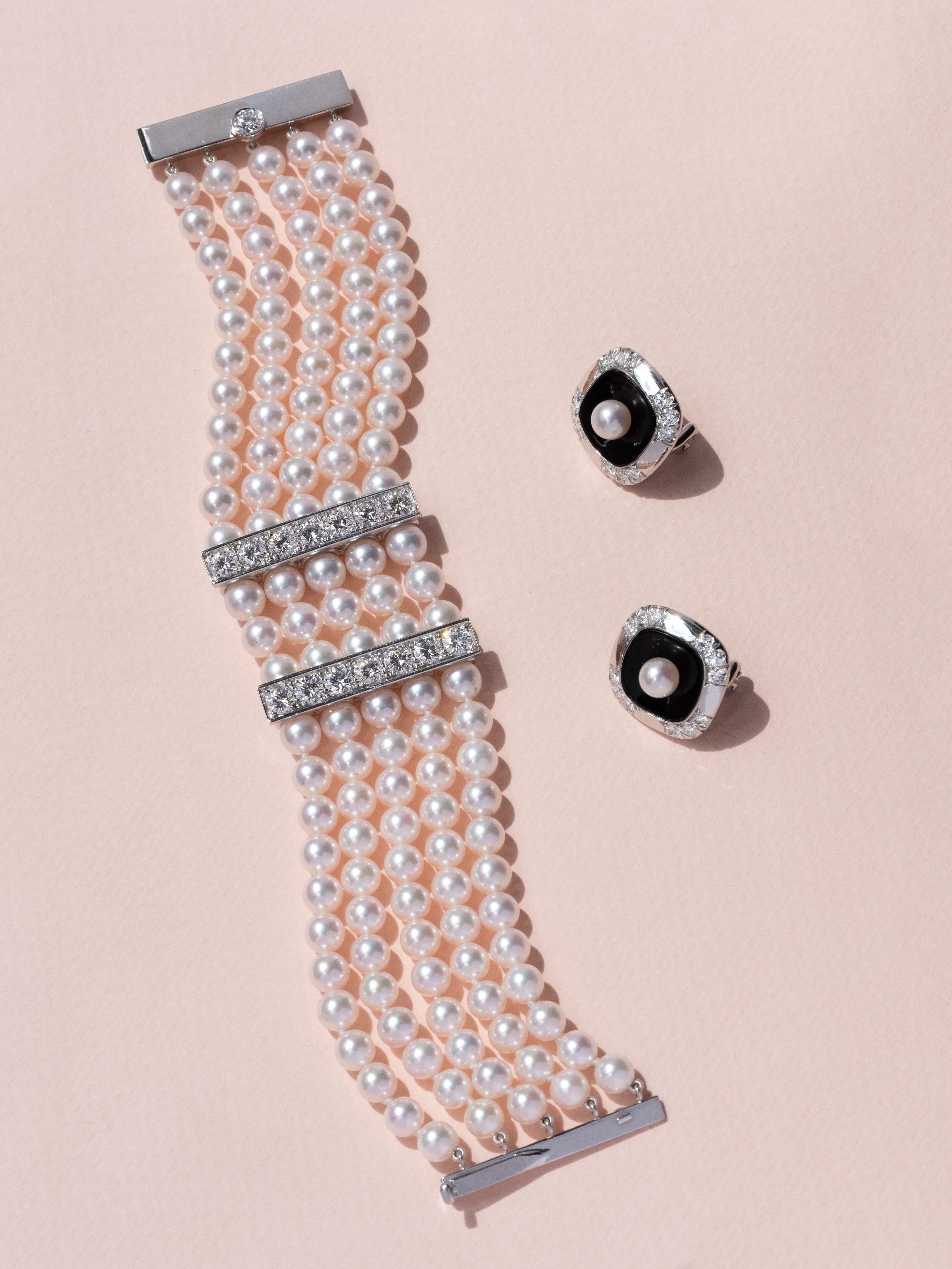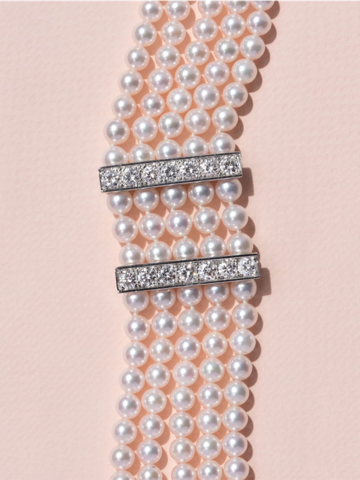 For Jean's bracelet, we worked with our pearl dealer to source the most stunning quality of pale pink Akoya pearls. Jean's diamonds are set into two handcrafted platinum spacers at the center, and connect to a custom wide box tongue clasp on either end with an additional diamond set as the push closure.