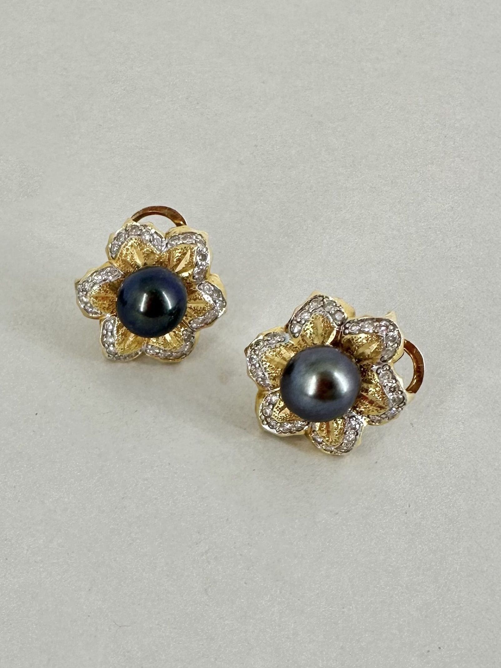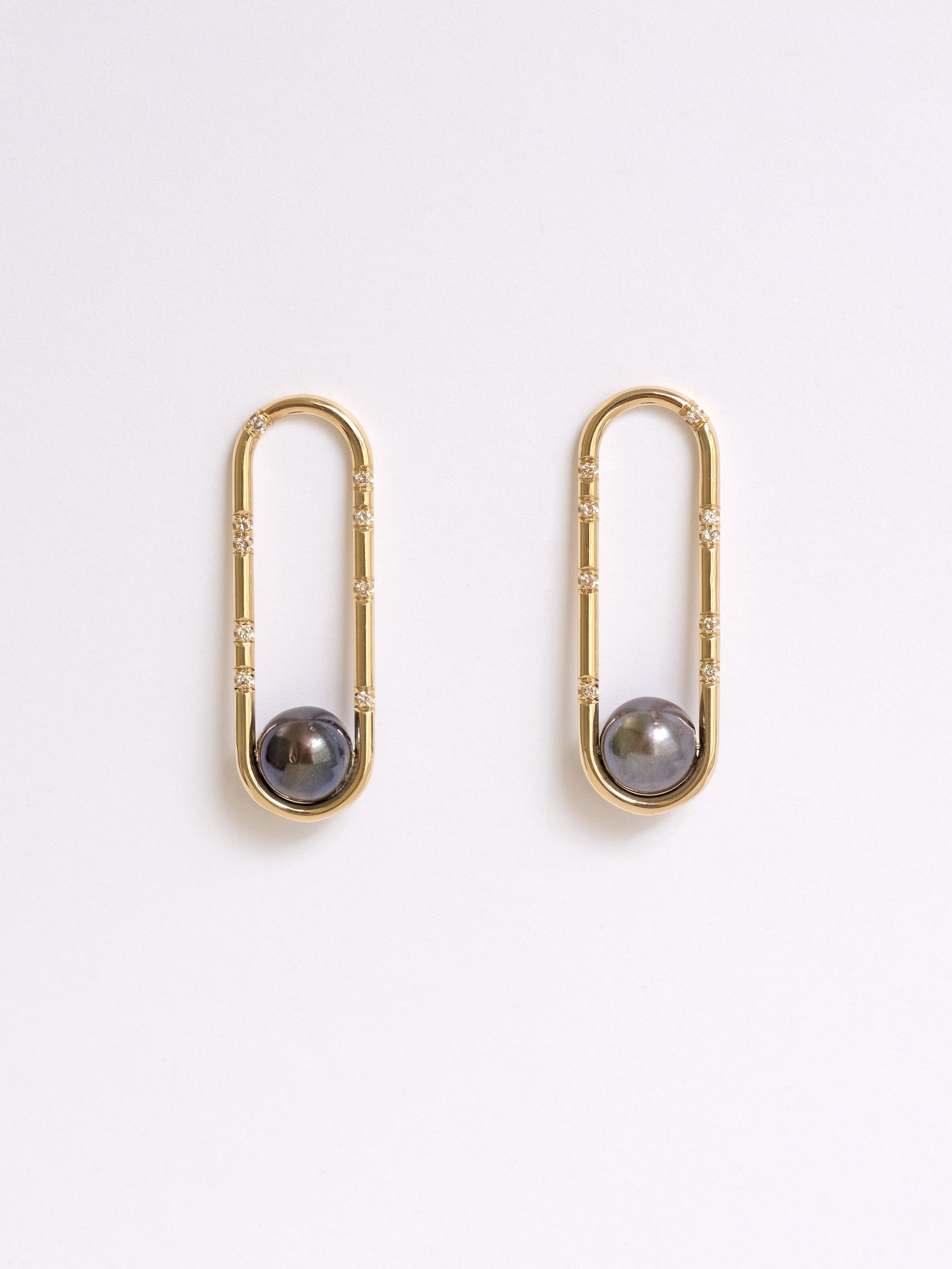 We redesigned Kara's black pearl earrings in long swooping golden ovals scattered with petite diamonds for a bit of sparkle.