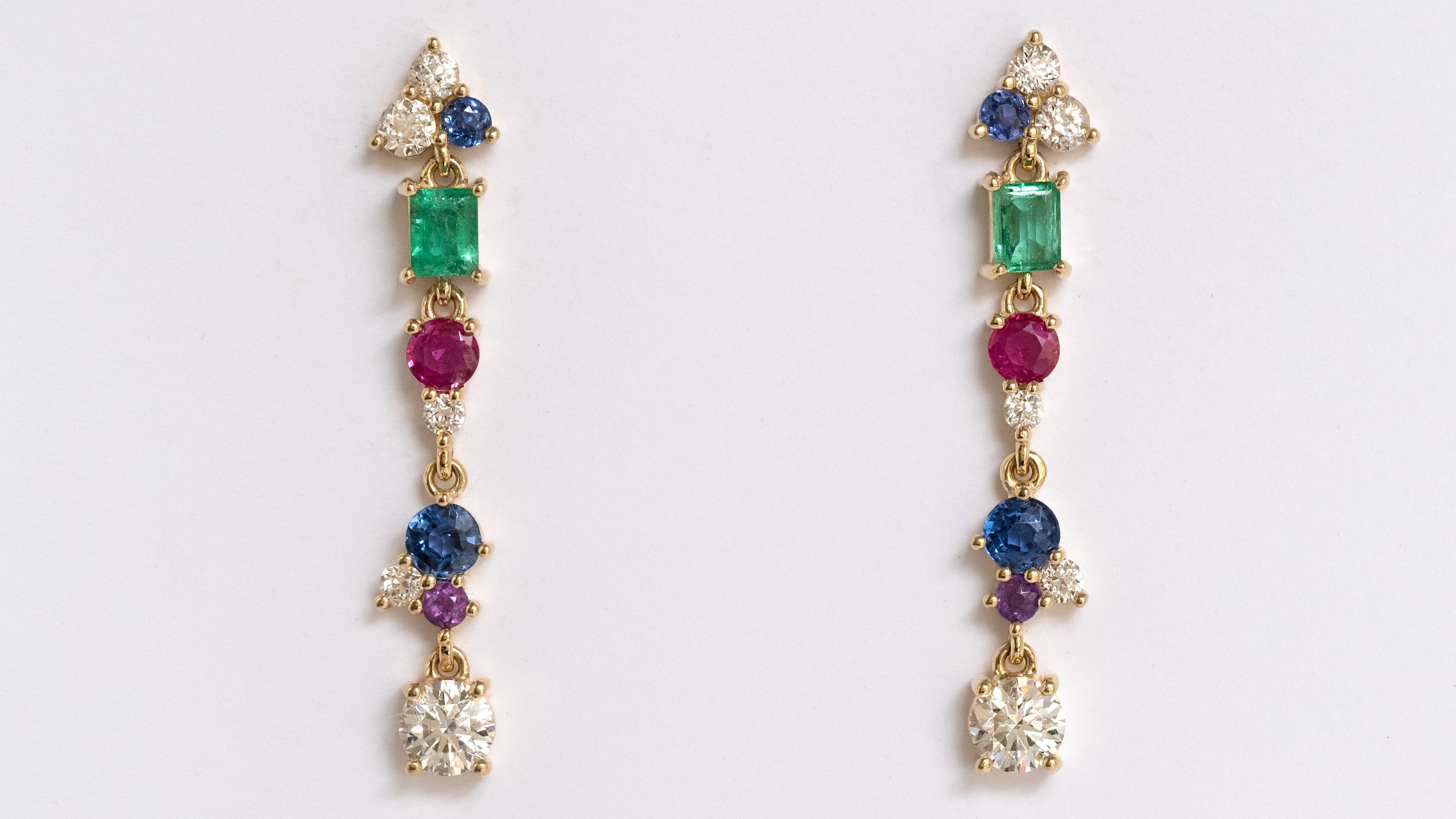 Laurie had recently unset a pair of emeralds from an heirloom ring for another piece and was inspired to use them for bold statement earrings. We incorporated her stockpile of sentimental inherited birthstones including, amethysts, rubies, diamonds and sapphires to create these long slightly asymmetrical dangly studs. Laurie told us her goal was to have earrings that made everyone say “WOW!” and I think we nailed it.