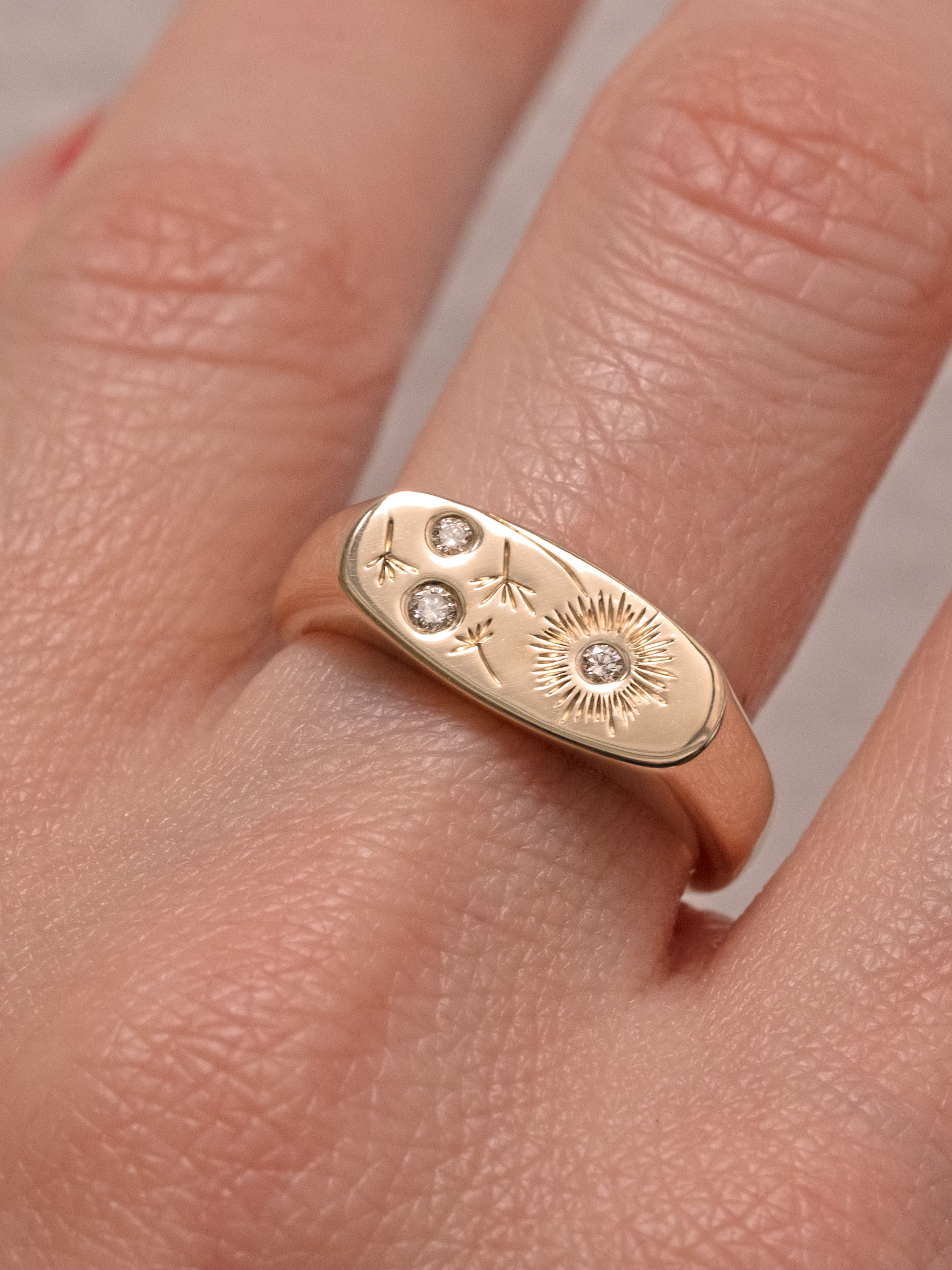 The signet is engraved with dandelion seeds, which are symbolic of hope, transformation, and healing.
