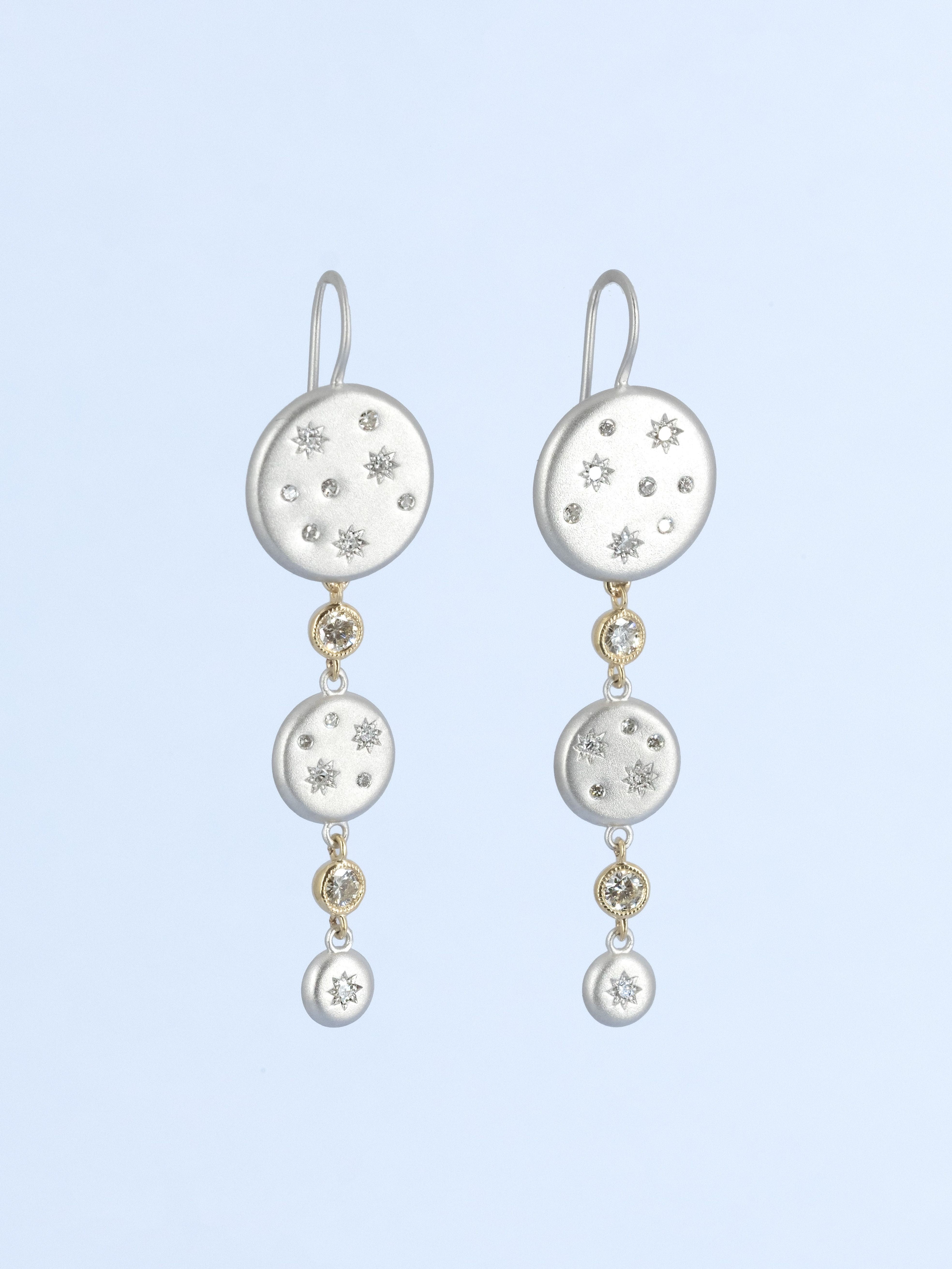 We've had the pleasure of working with Madeleine on a few projects over the last several years and were so excited when she came back to create a pair of versatile dangle earrings. Using petite diamonds from an anniversary band that belonged to her grandmother, and slightly larger diamonds leftover from a different project, we created this graduated pair of star set scattered disc earrings. This particular grandmother was, as Madeleine called her, an "earring freak," and I think we can all agree that she would freak over these earrings.