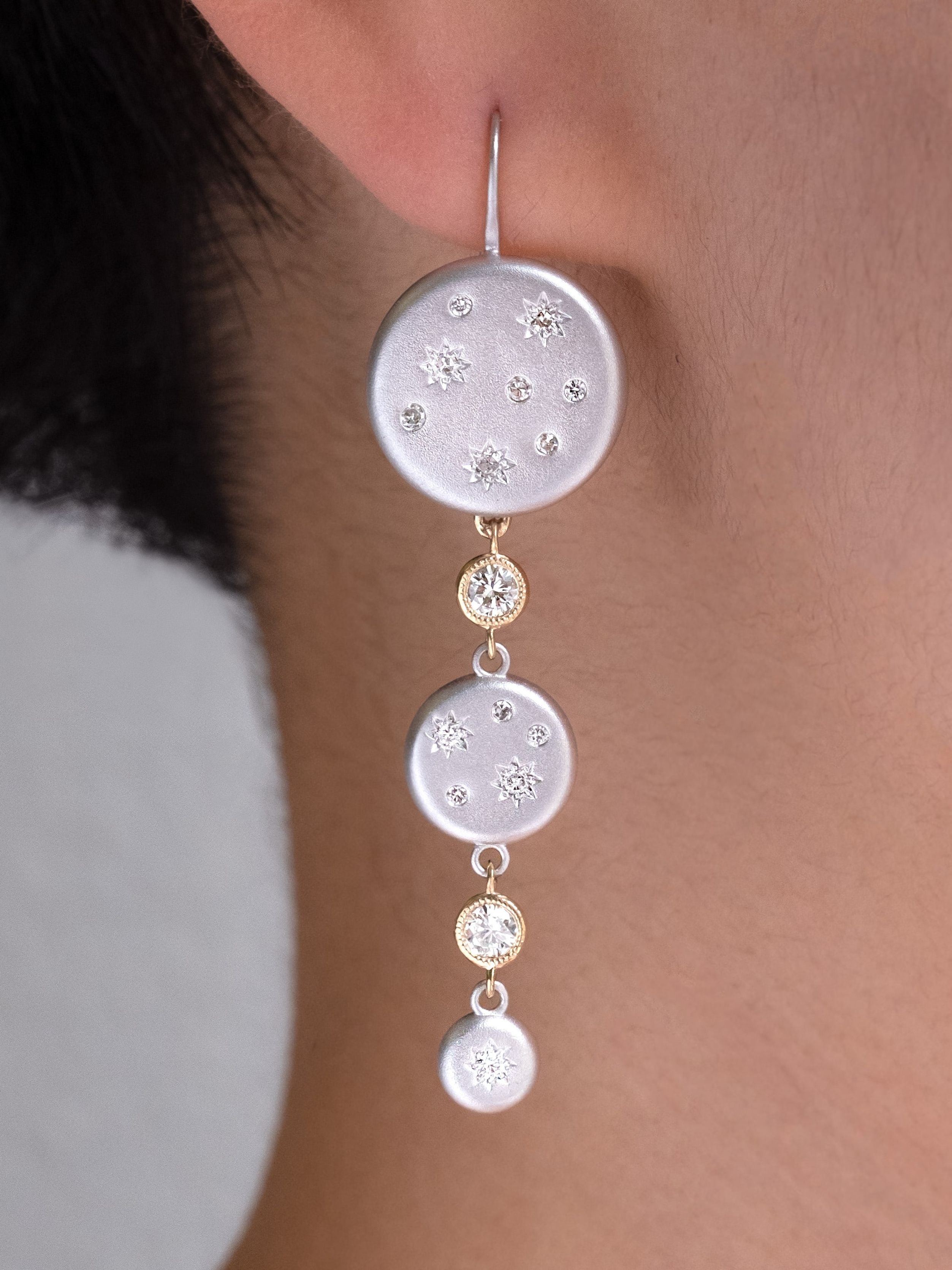 With so many design elements happening at once (matte finish! mixed metals! star settings! millegrain!), everything still came together seamlessly to create a versatile, textural pair that we were all swooning over. The best part about these earrings though? The bottom section can be removed, resulting in a classic pair of disc drops that are perfect for everyday.