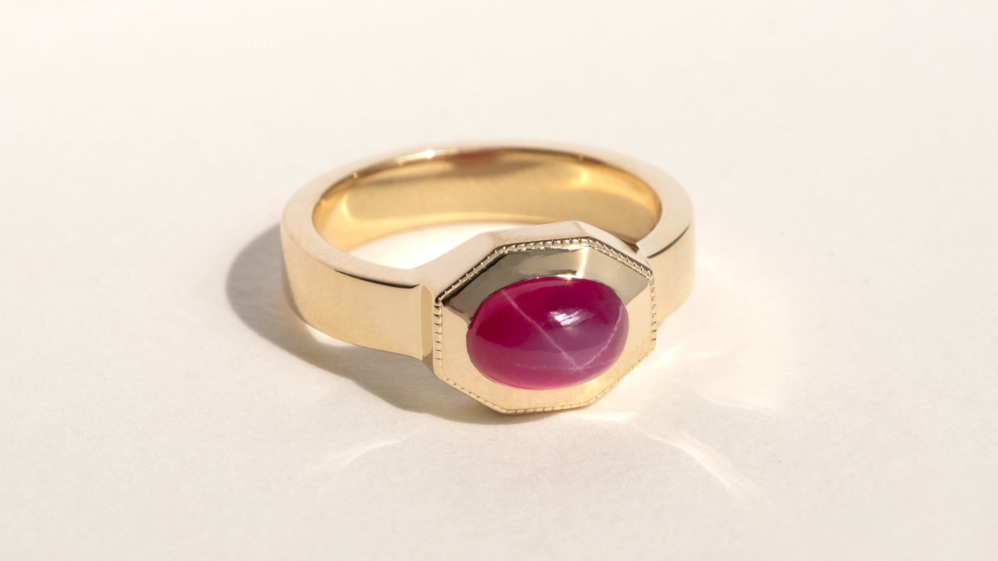 Mikiko's star ruby ring was passed down to her by her mom from her great-grandmother. It was set incredibly high off the hand and didn't fit her style, but she wanted to find a way to enjoy it. We reset the gemstone East-West in a geometric plaque style ring. Delicately engraved millegrain lightly echos the ornate decoration of the original setting. Star gemstones are so special and it was an absolute pleasure to work on this piece.
