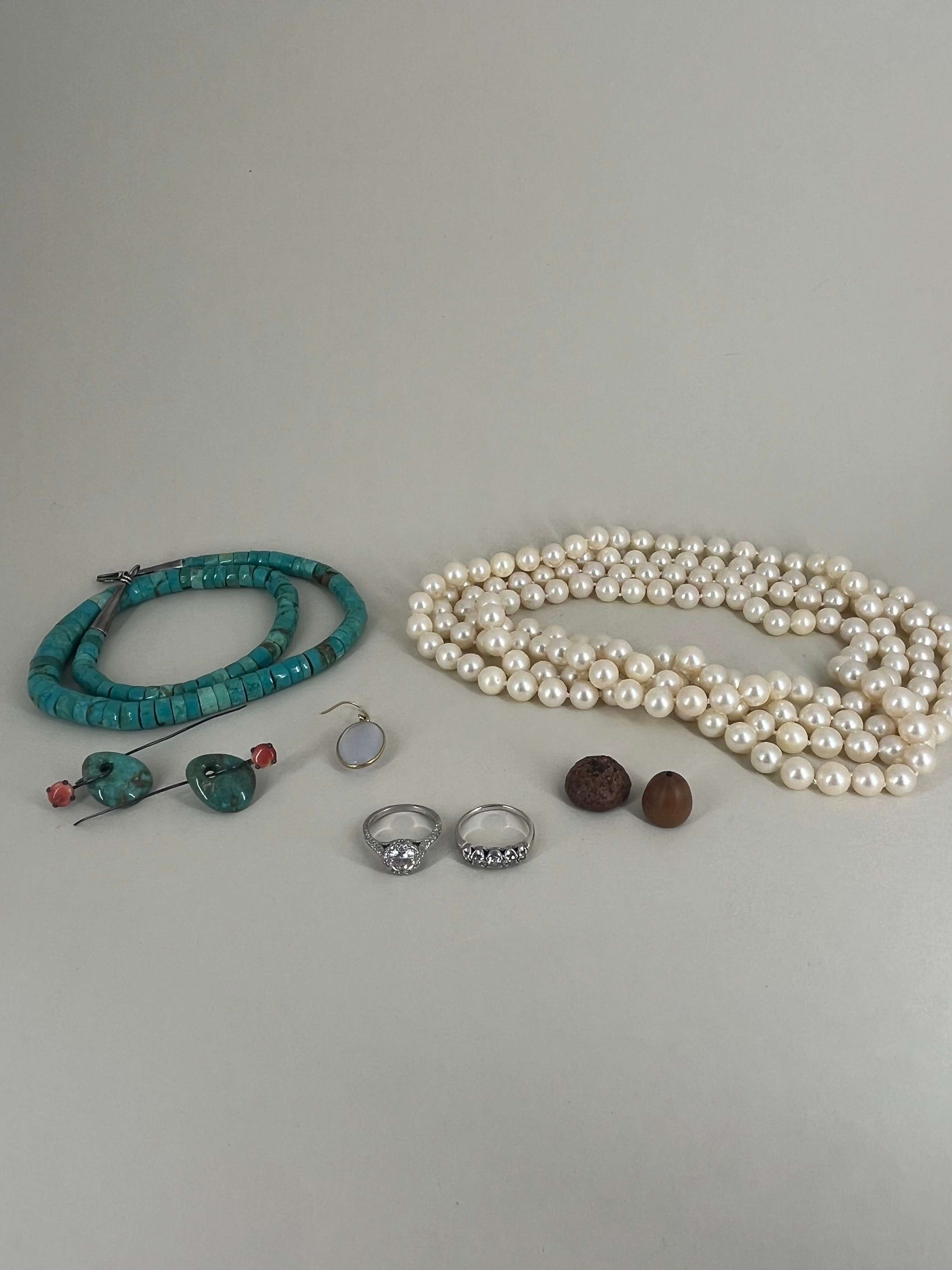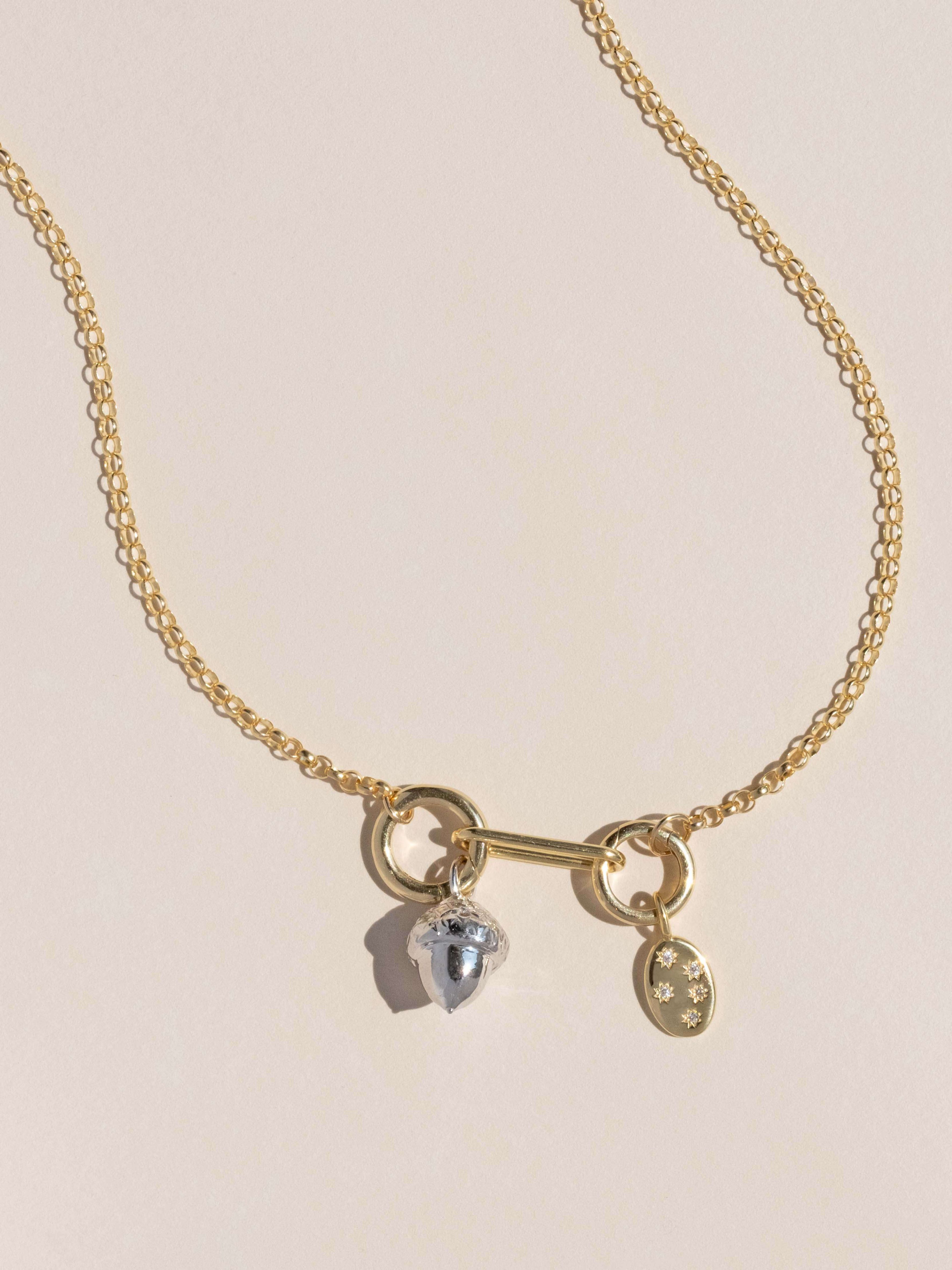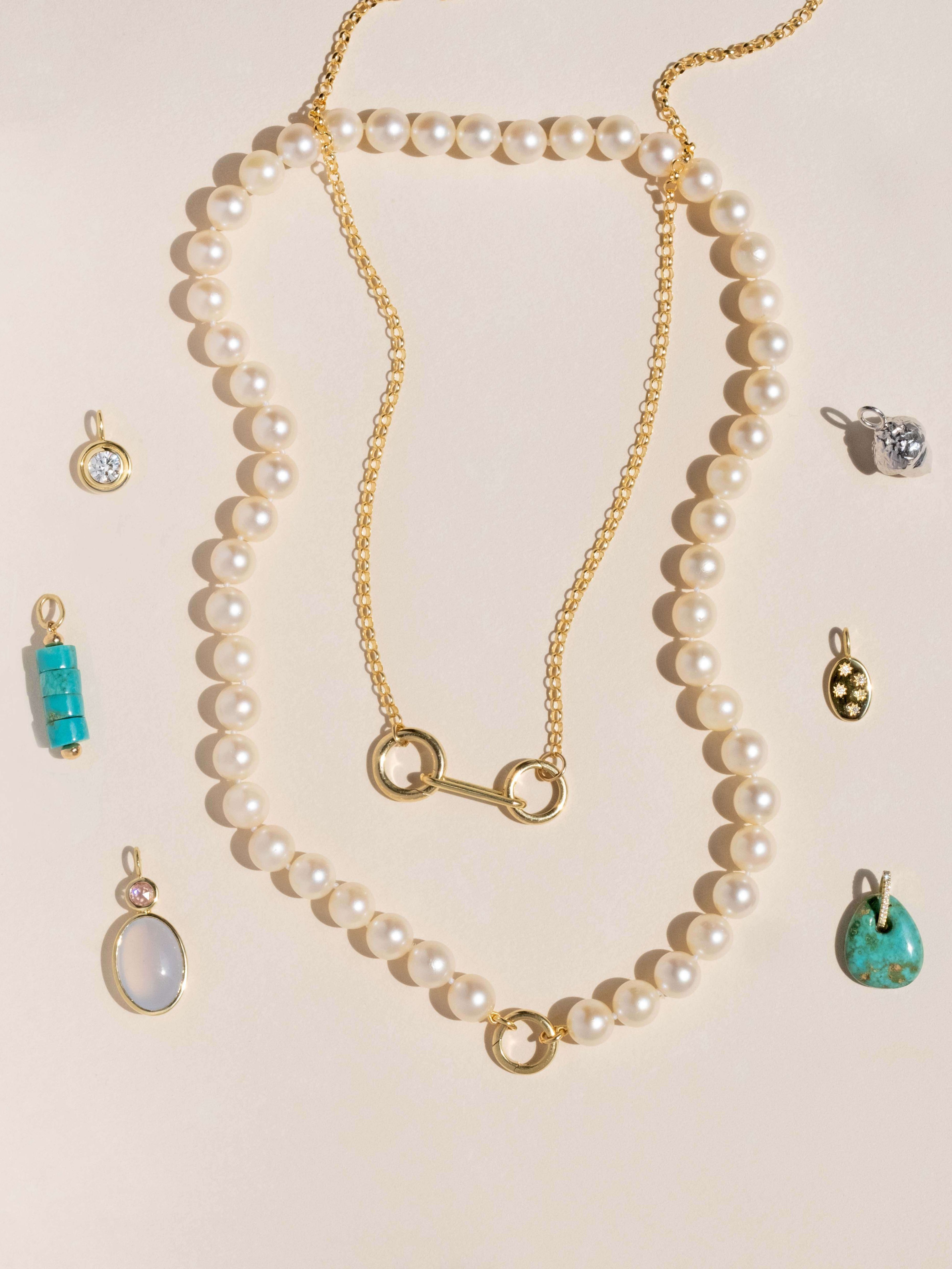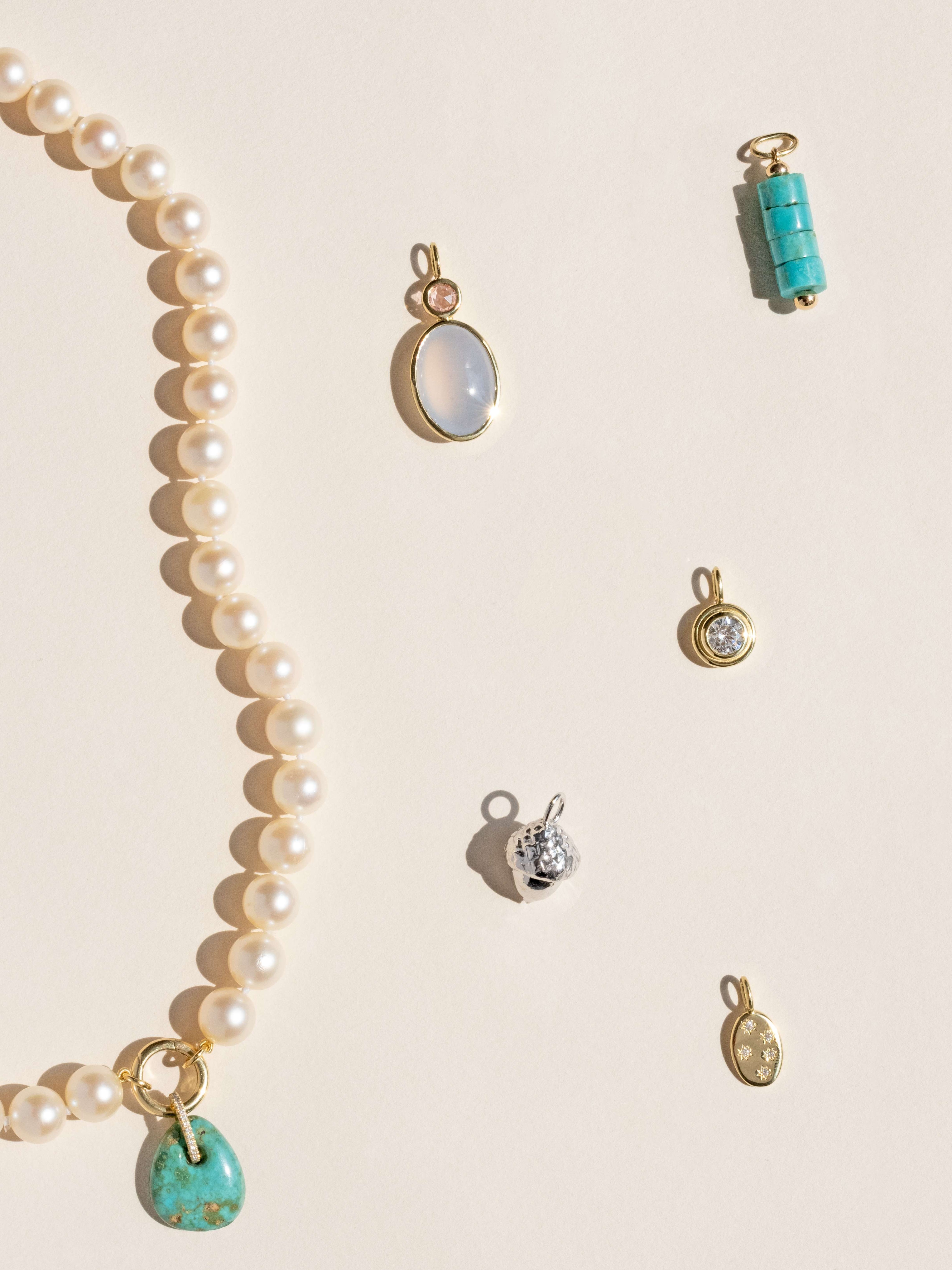 Monica's mother once gave her a perfect tiny acorn. A natural jewel. After she passed away, Monica had the idea to create a piece of jewelry from it. We recreated the acorn at an even smaller scale and cast it using white gold from her mother's wedding ring. That is just one small detail of this incredible piece which is anchored by Monica's stunning heirloom pearls. We created Interchangeable charms from all different bits of Monica's jewelry - a single earring, a necklace that she never wore, and more. It can be worn in countless different ways and each arrangement tells a different story. A wild party, love, loss. It's all in there.