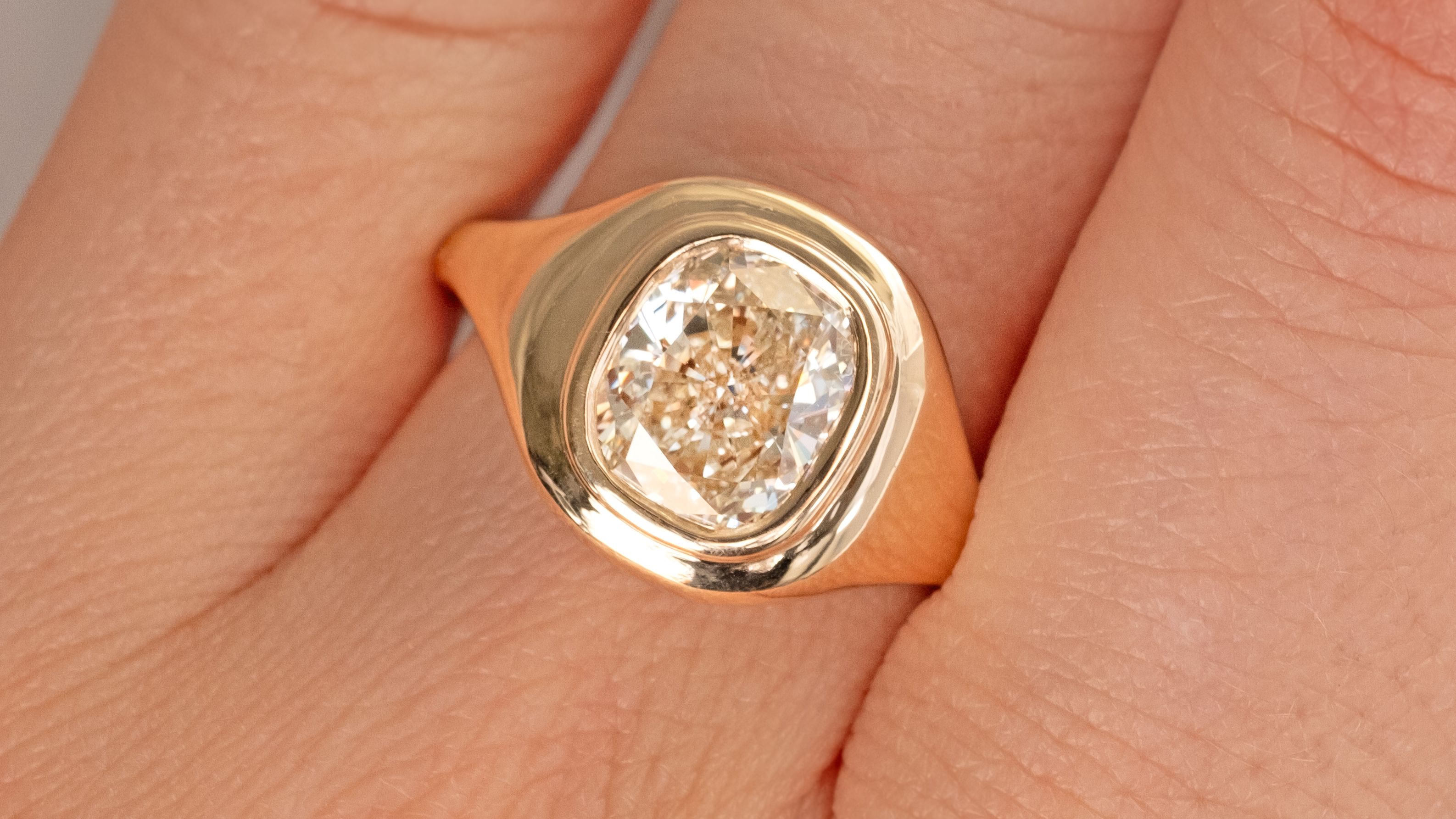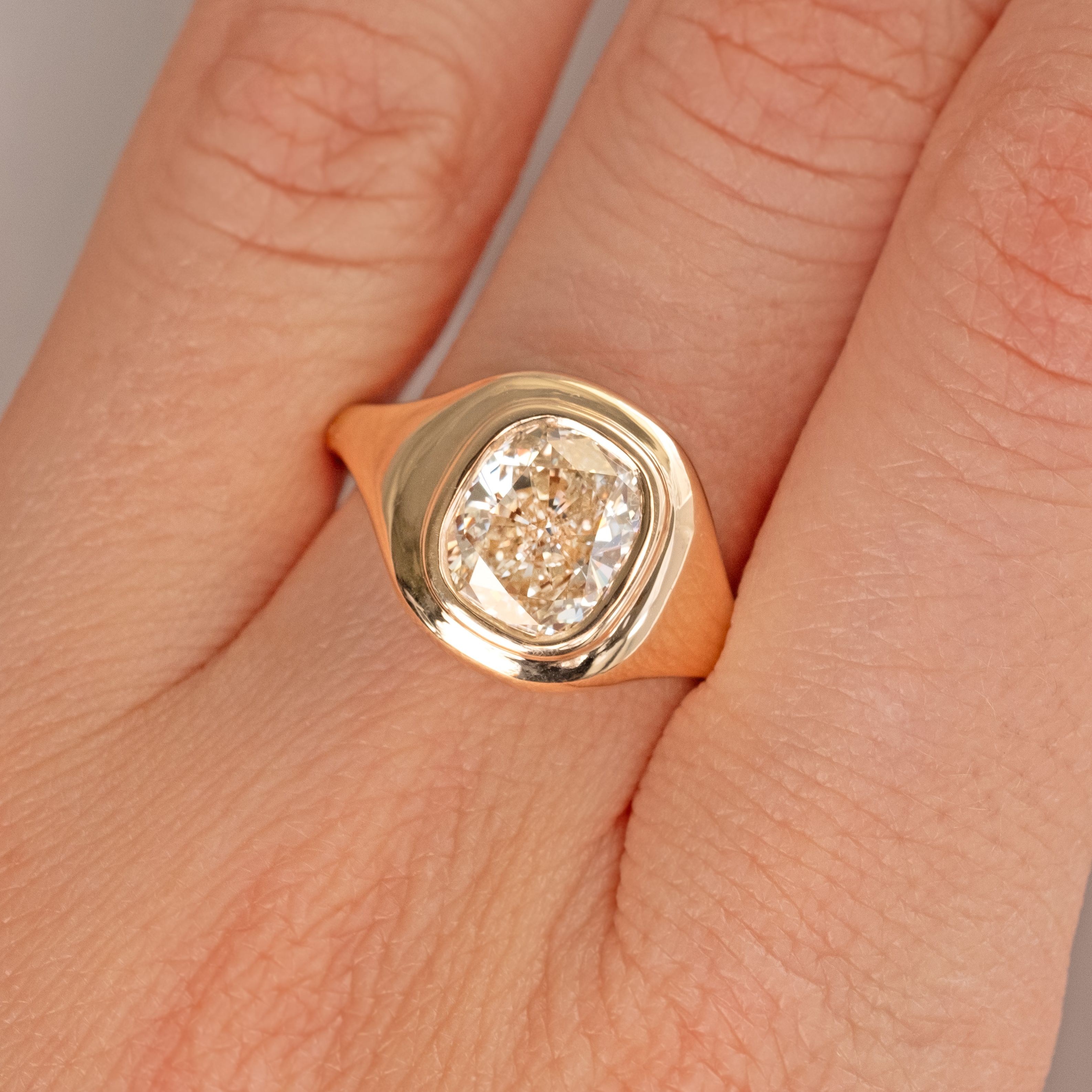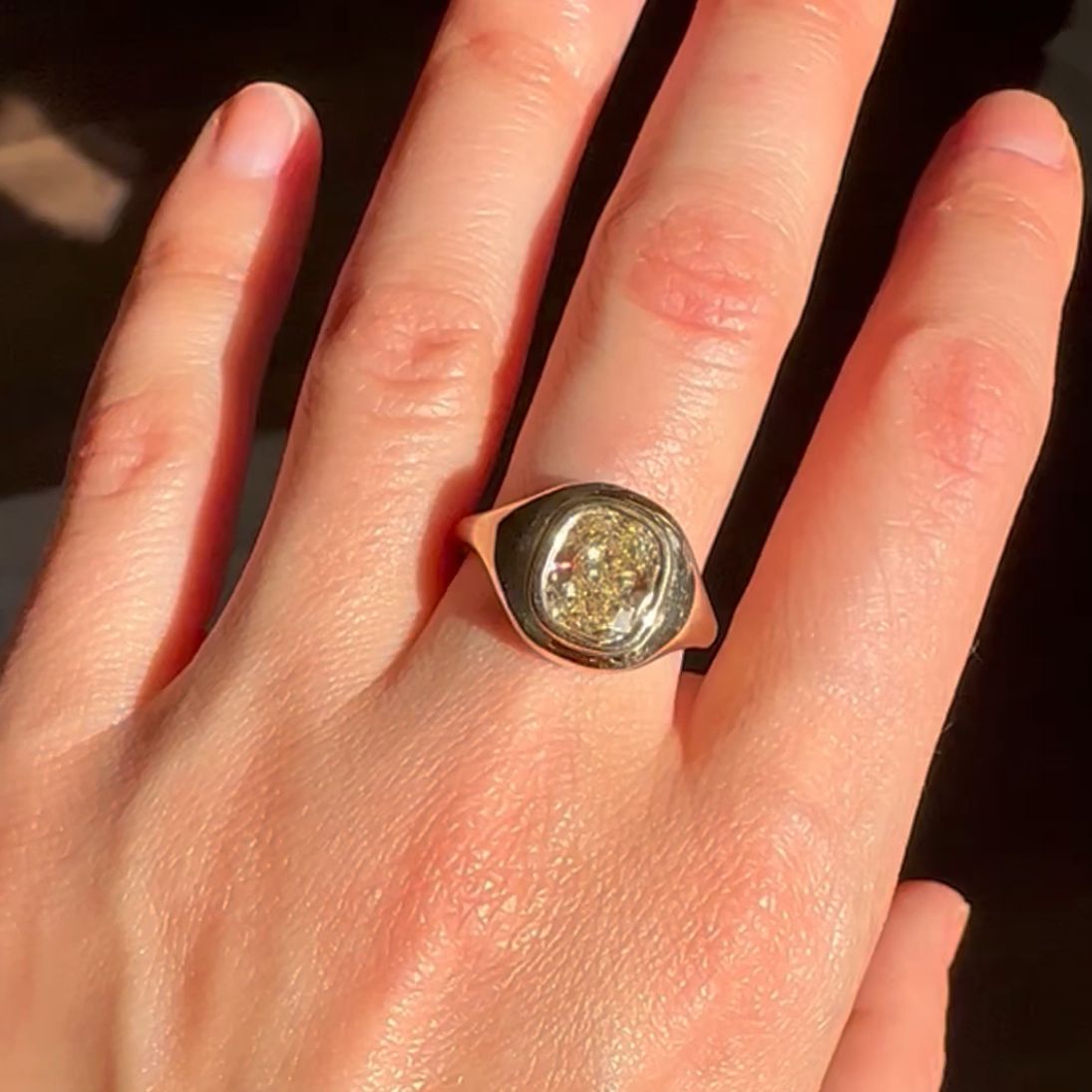 We set the diamond in an incredibly comfortable low profile signet style setting with a subtle double bezel detail. The warm yellow gold works perfectly with the warm hue of the diamond. We just could not get over this ring in the studio! We all wanted to keep it!
