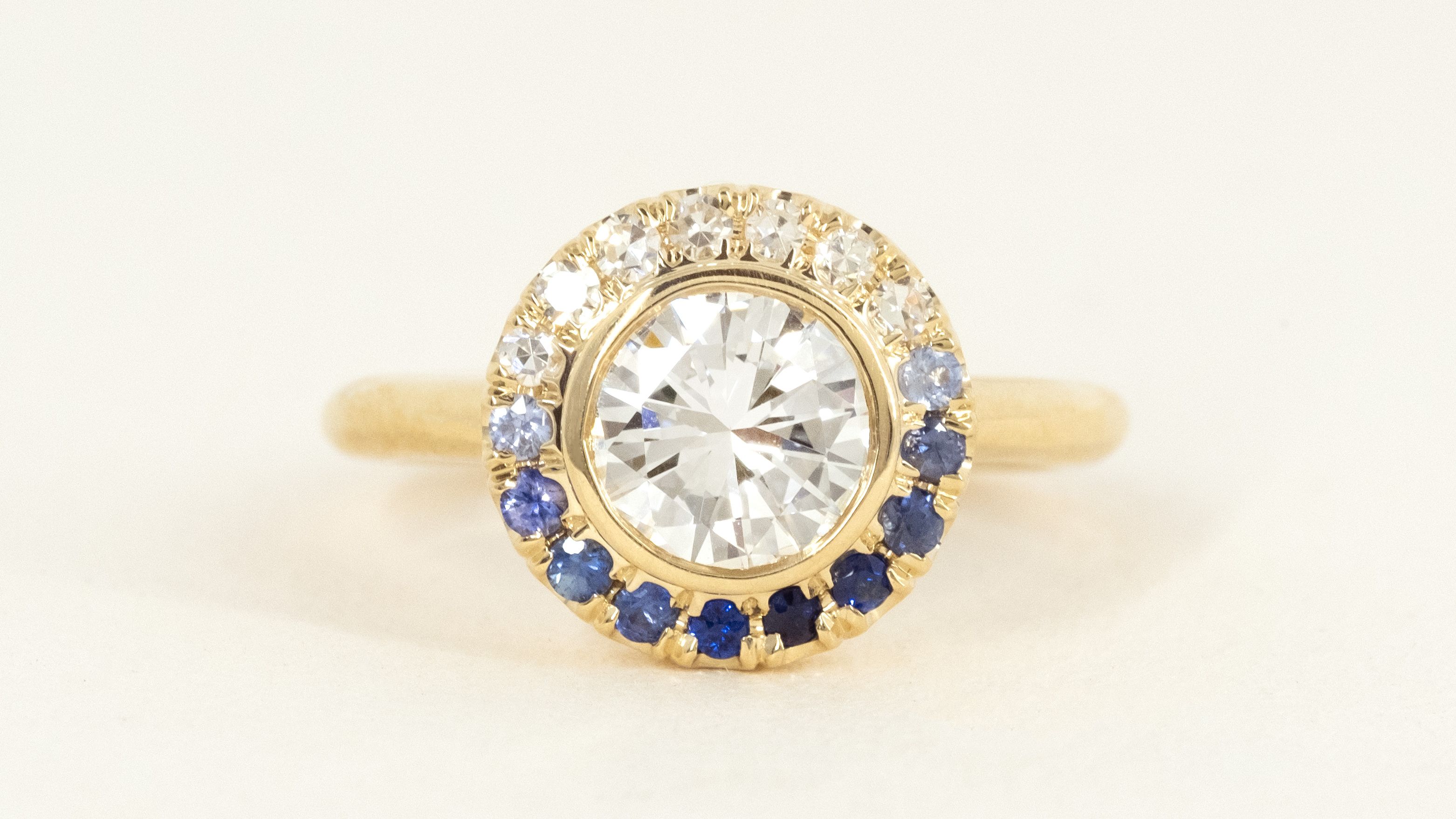 Rachel came to us to repurpose the central diamond in her grandmother's engagement ring for an engagement ring of her own. Working in medicine, she didn't want anything too high profile and was interested in a touch of color. Our design is a playful take on a classic halo with a color gradient -from the deepest night sky sapphires to the palest cornflower blues. Congratulations Rachel & Nadav!
