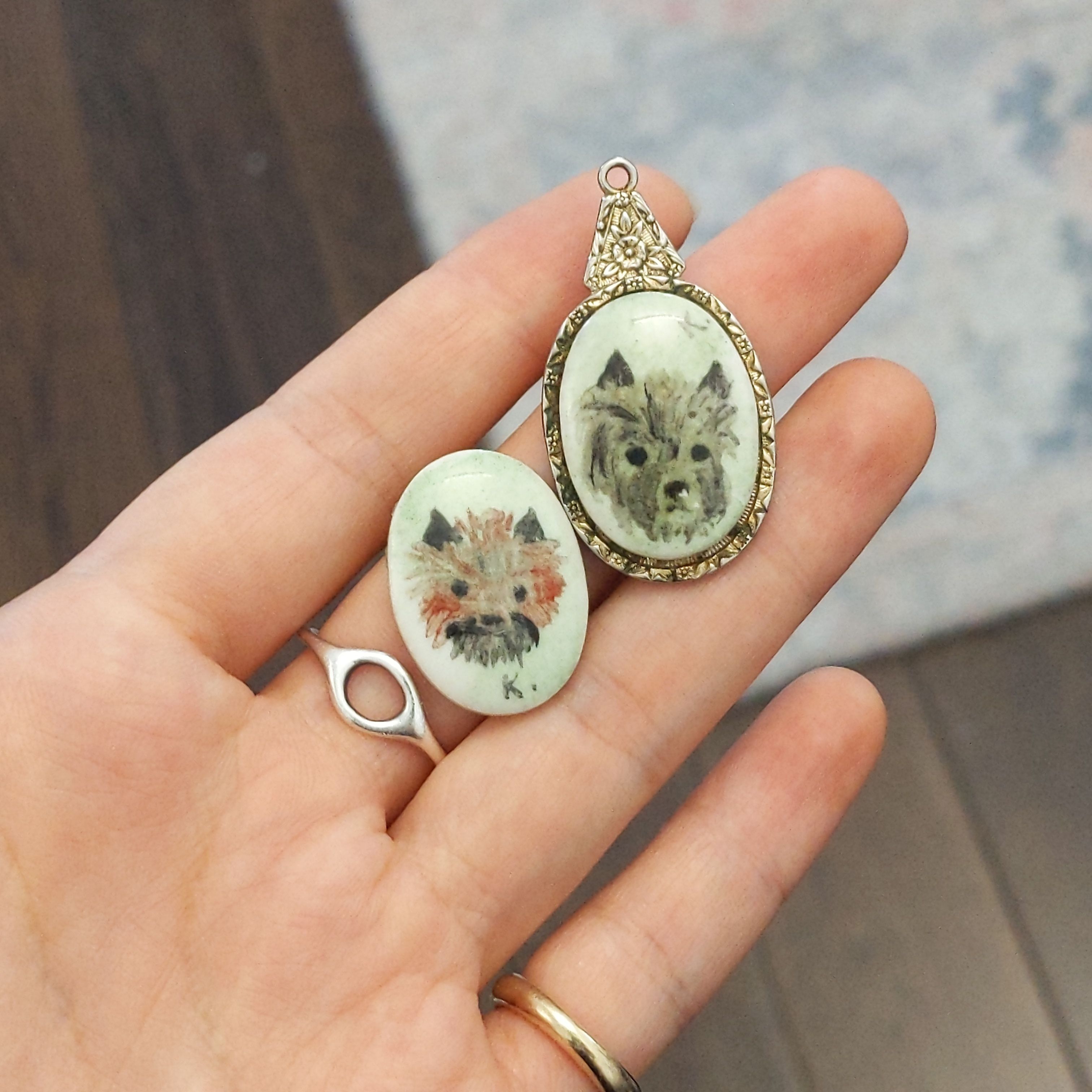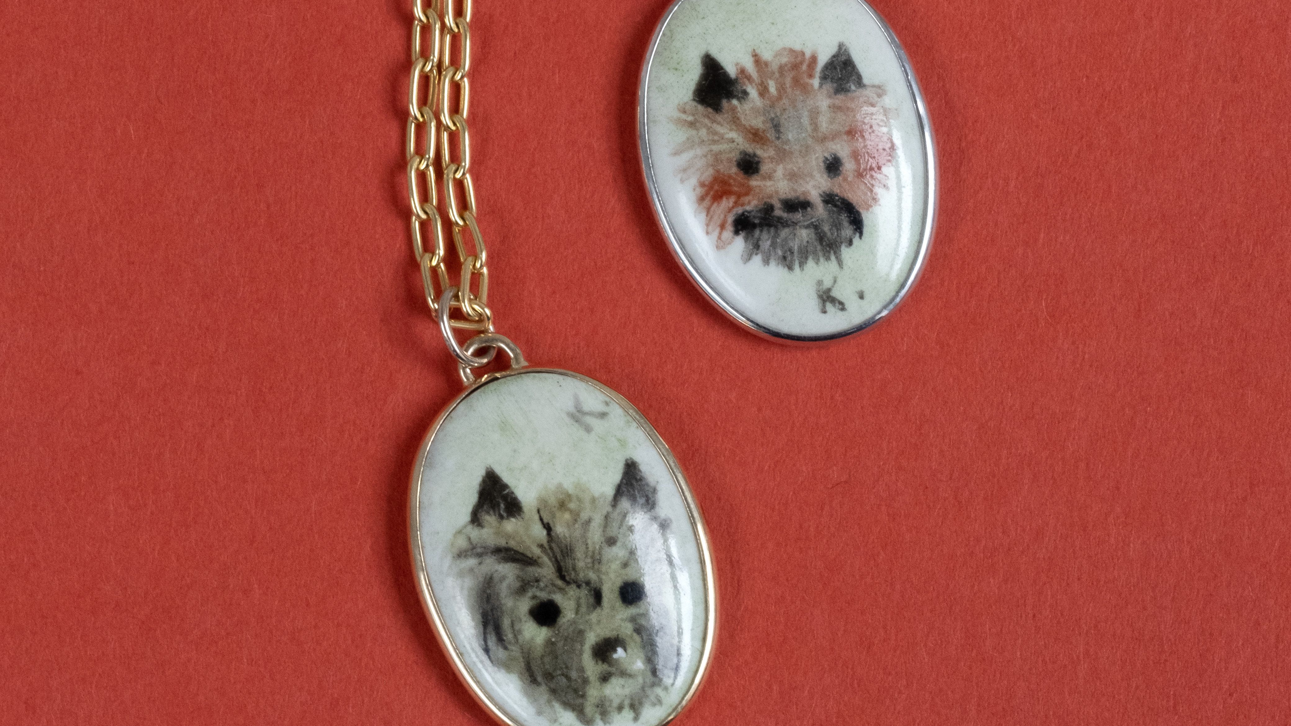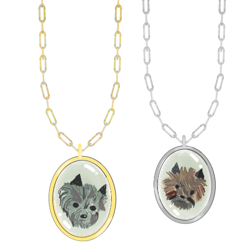 We know who got the best gift this year and it was Amy’s two daughters. It's ok to be jealous. I can't tell you how obsessed we were with these terrier portraits in the studio. Yes, they are now a custom emoji in our work group chat. The original settings were glued and the glue had come loose making these furry talismans too delicate to wear. We love the opportunity to upgrade treasured objects to fine jewelry. We carefully reset the portraits in solid gold and hung them from oval link chains.