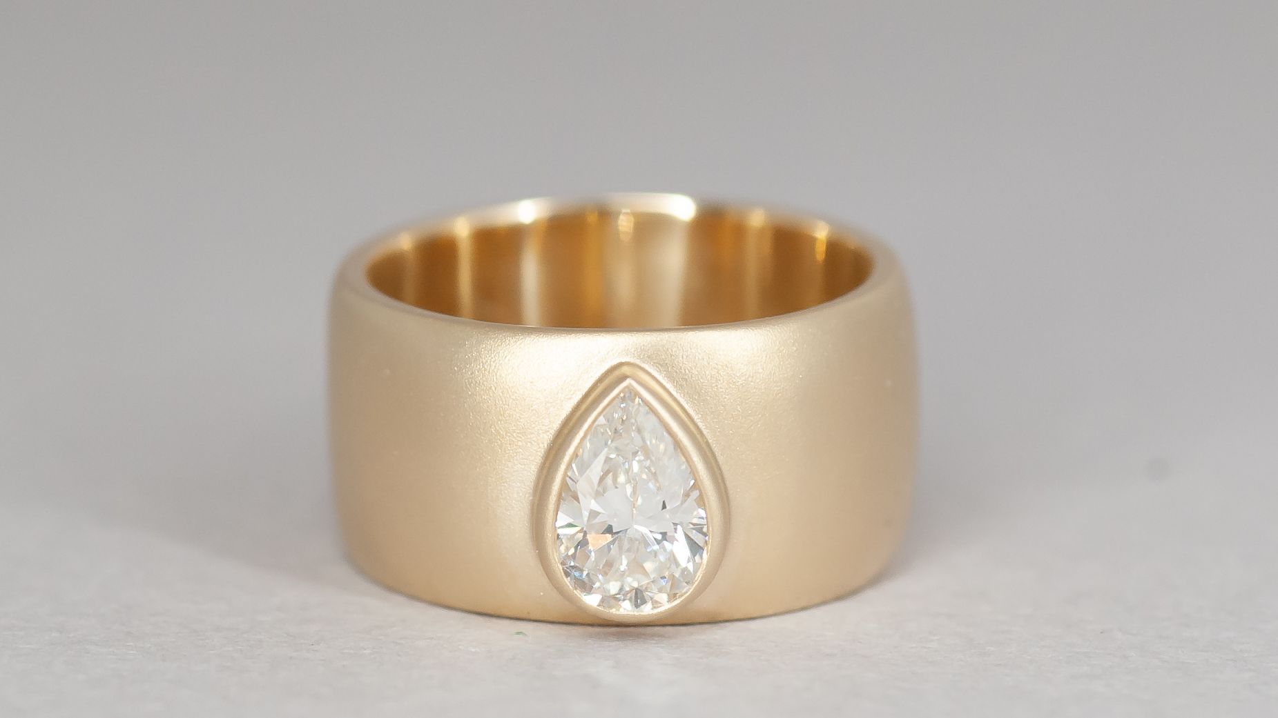 When Peyton’s fiancé, Nick, was in the 4th grade he “fell in love” with his substitute teacher. He snuck into his mom’s room and took her diamond ring to propose with. Ever since retrieving the ring from Nick’s teacher, his mom always felt the ring was his to propose with someday. To fit Peyton’s understated, architectural style, we reset her pear shaped diamond in a wide matte gold band. A corresponding matte flush set band utilizes her round diamonds and can be worn stacked with her engagement ring. Thank you Peyton for sharing this project with us and thank you Nick for being such a romantic!! ❤️