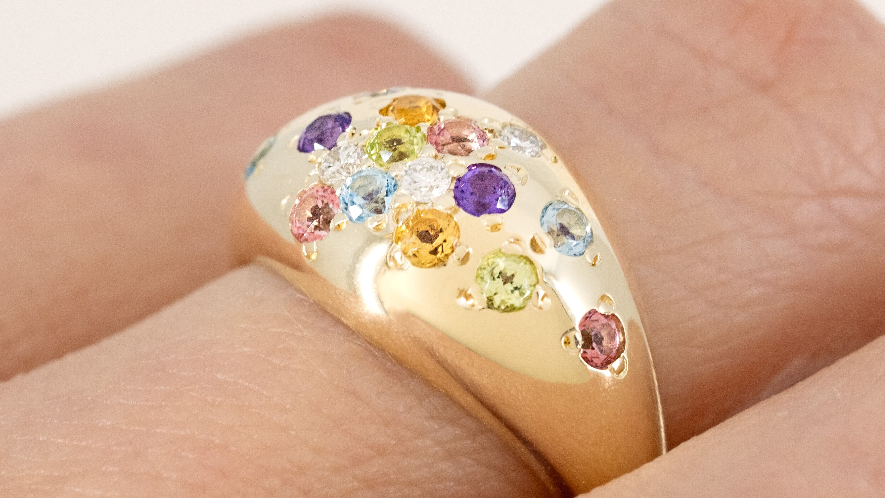 Renovating Raphaelle's colorful 1980s bracelets has provided us with so much joy in the studio! We recently completed two rounded signet pinky rings for her (to ultimately gift to her children) using a selection of all different gemstones from her original pieces. These were so comfortable and fun to wear we were genuinely heart broken to part with them!