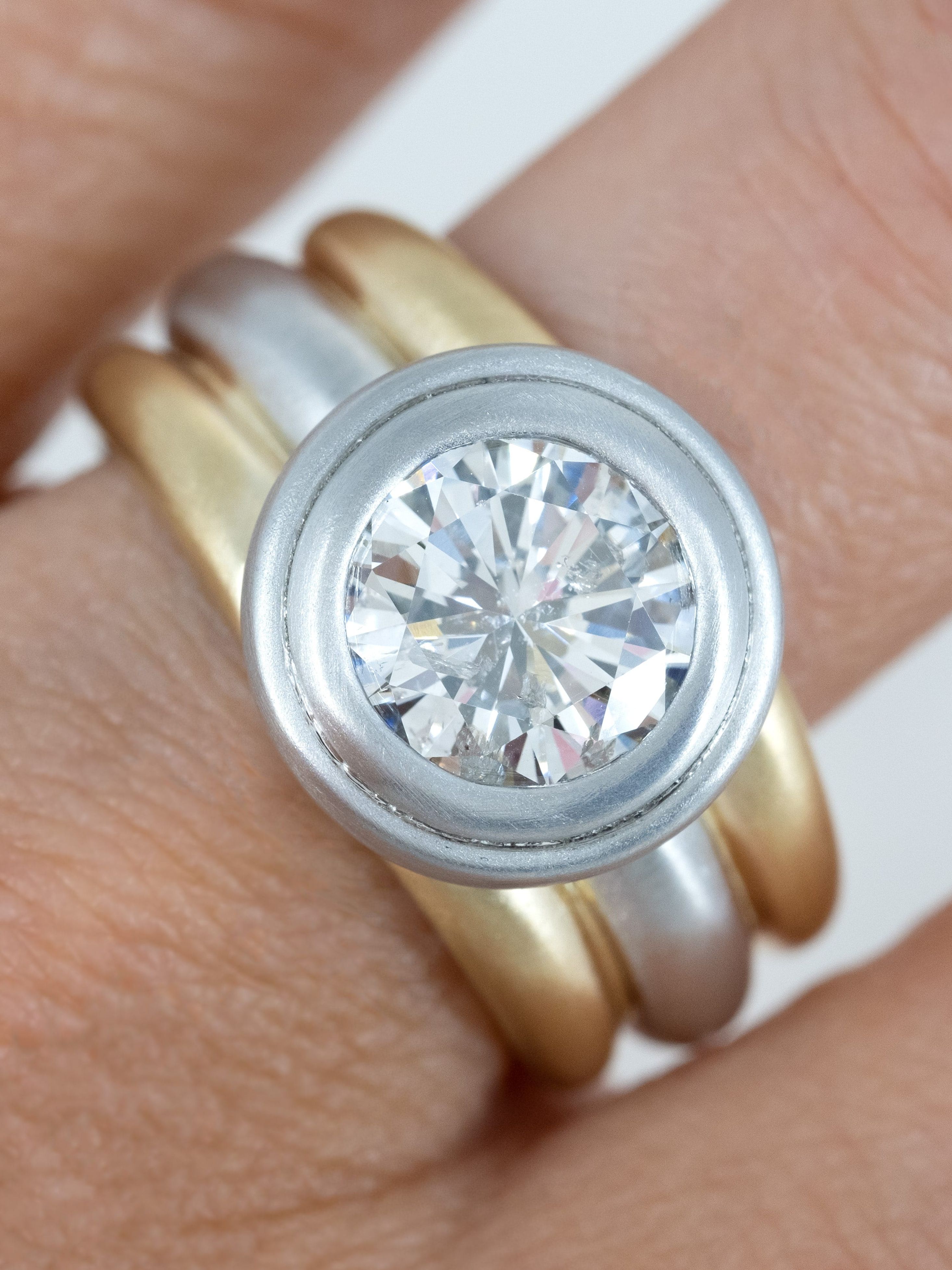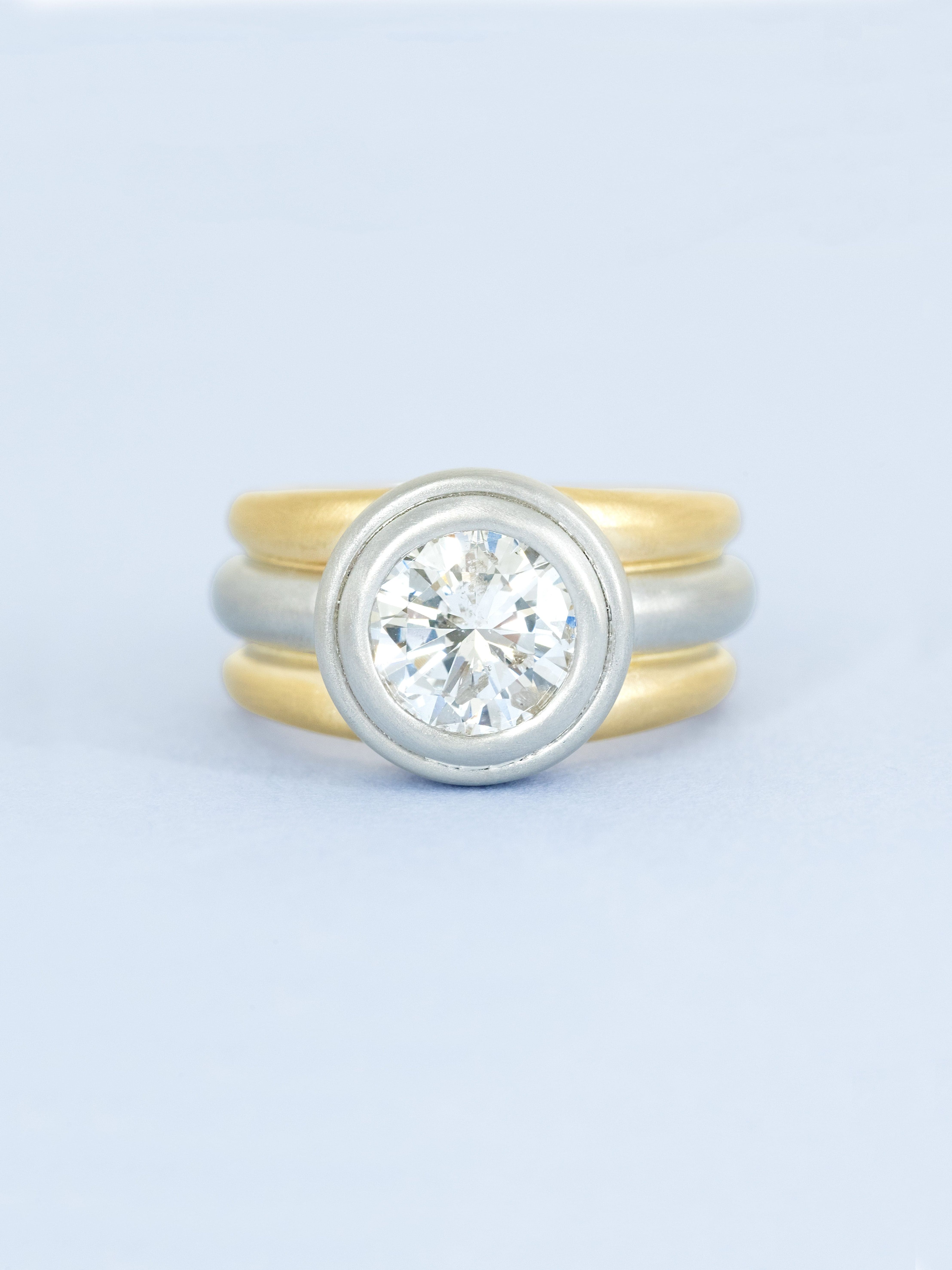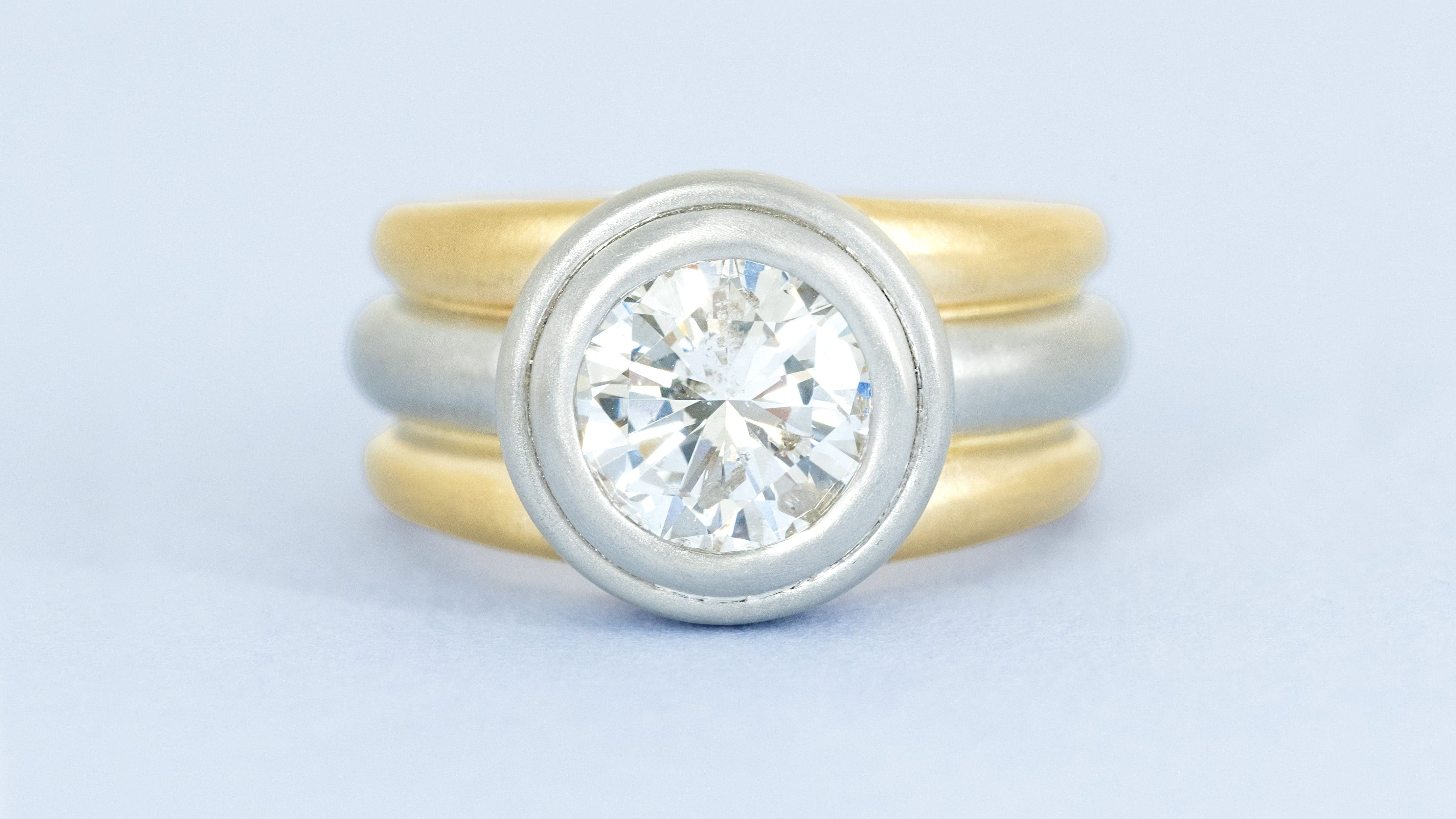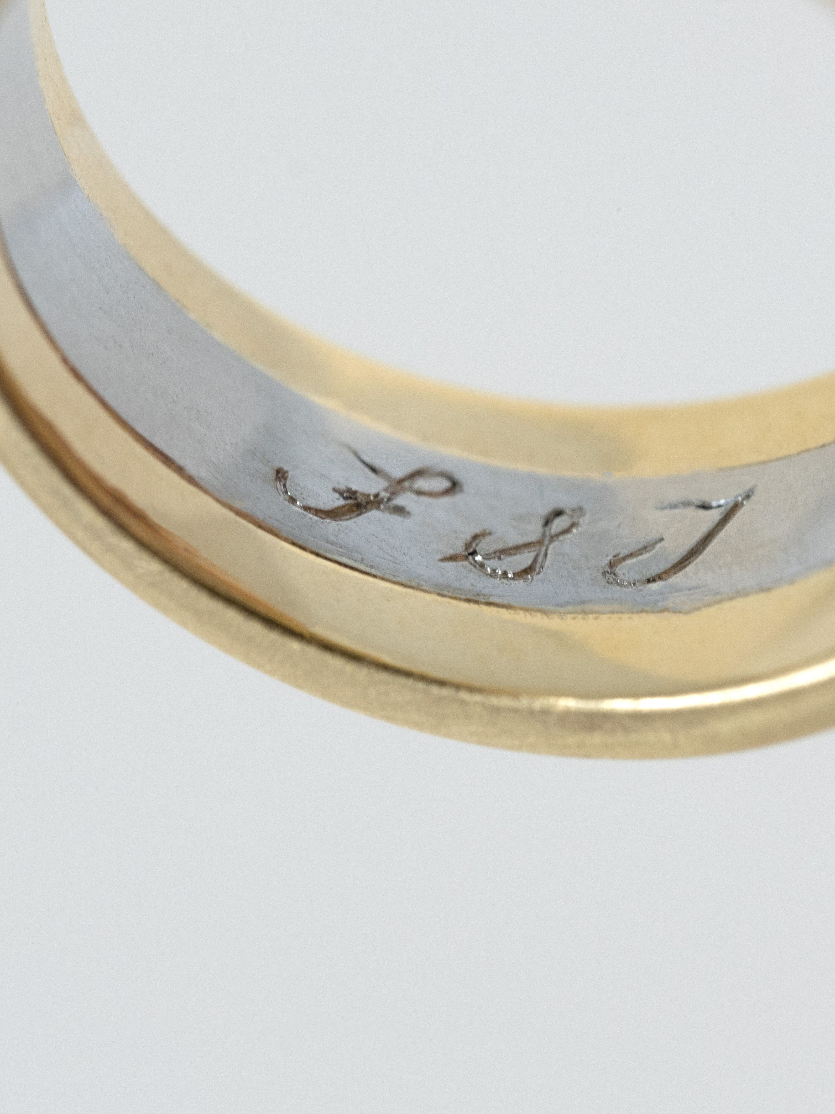 Jillian's grandmother was always transforming her jewelry (much like my own!). When she inherited her grandmother's ring, she was inspired to have it made into something her mom, Peggy, would enjoy wearing every day. Peggy requested a bold style that didn't feel "engagement-y" and we were delighted to deliver. We hand engraved Peggy's parents' initials on the inside of the band to reflect that the original ring was a gift from Peggy's dad to her mom.