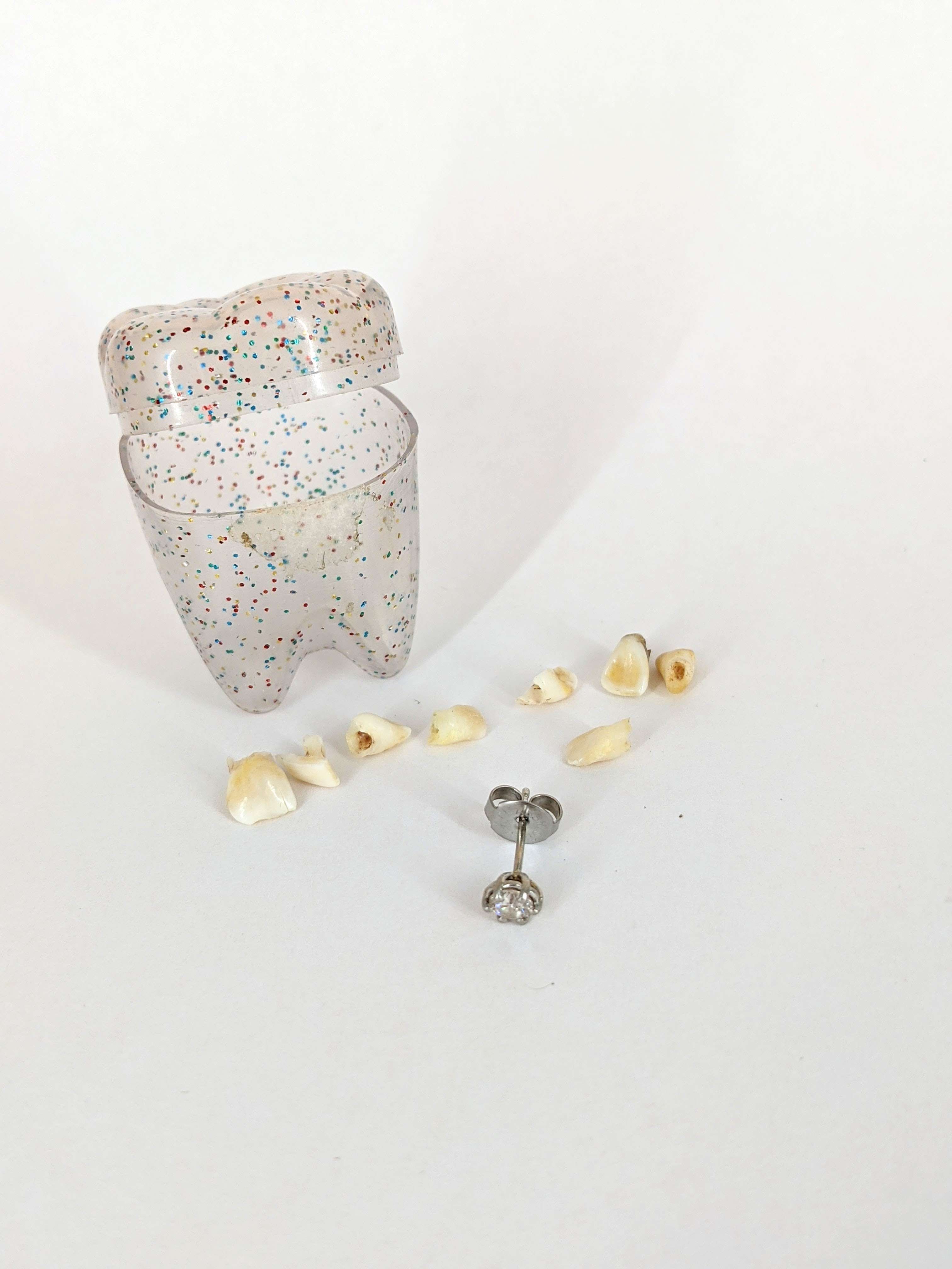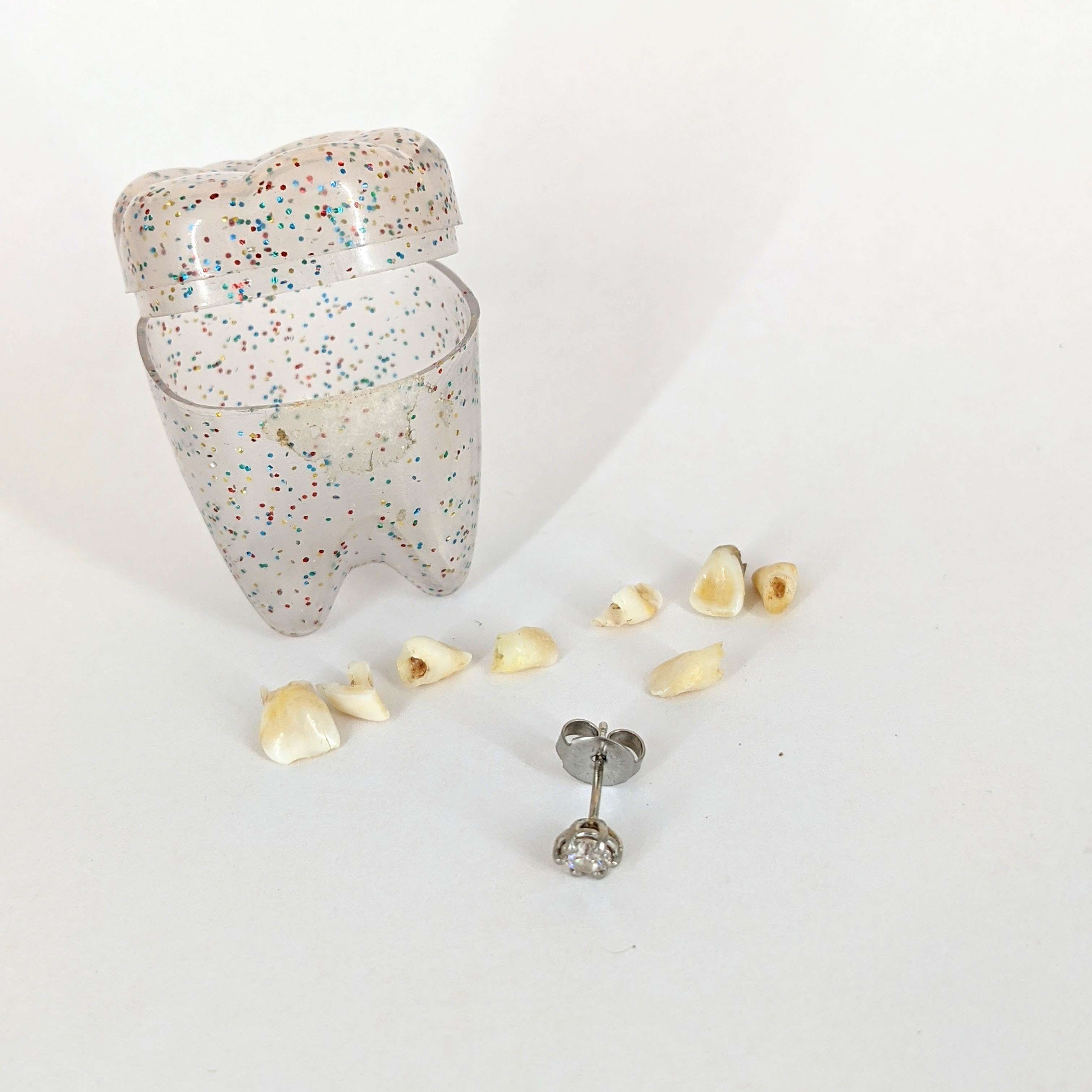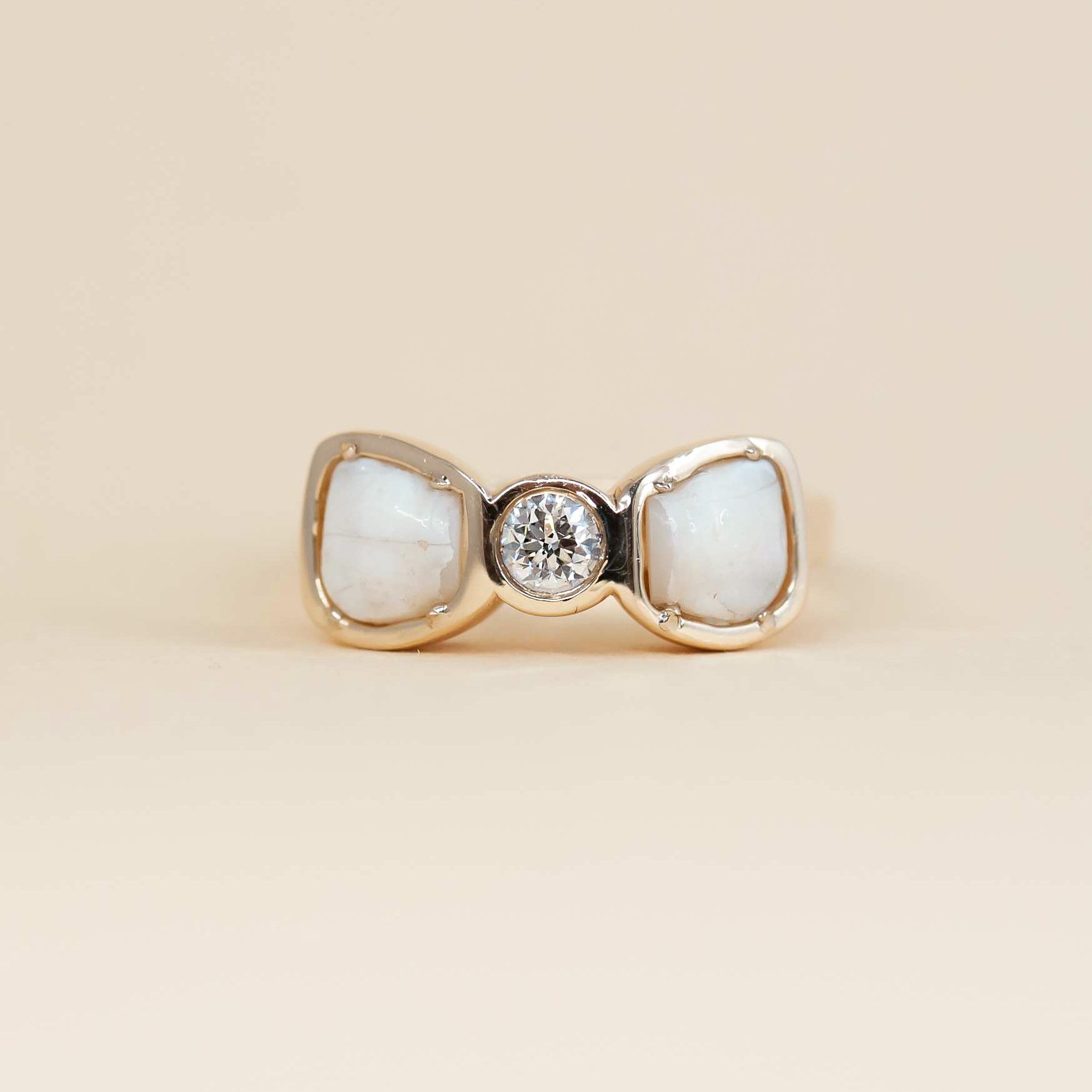 Lauren sent us a selection of her children's baby teeth to choose from for this Edwardian inspired milk tooth ring. The Edwardian's loved ribbon and bow motifs, and they are a personal favorite of mine as well. We went back and forth with Lauren between using one of her pearls and one of her diamonds as the center stone. Ultimately we loved the contrast of her sparkly diamond at the center. The baby teeth teeth remain the focal point forming the bow. Micro claw prongs secure the teeth in the bezel settings, adding another antique inspired detail. This was such a fun project and we loved working on it!